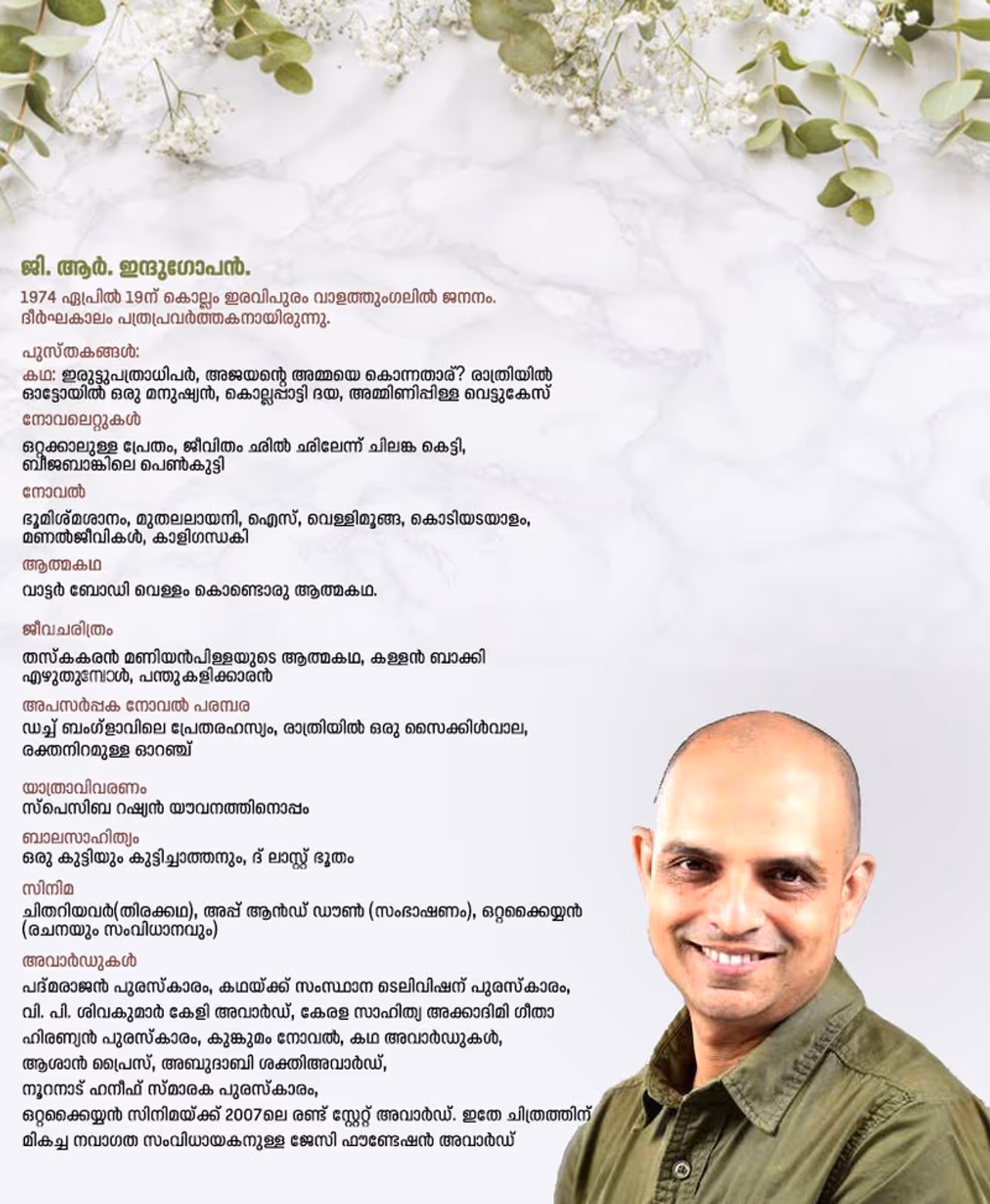 മനുഷ്യരുമായും സംഭവങ്ങളുമായും നിരന്തരം ഇടപെടുമ്പോഴും വാര്ത്തയിലേക്കു മാത്രം ചെരിഞ്ഞുവീഴുന്നൊരു ജേണലിസ്റ്റിന്റെ കണ്ണ് ഇന്ദുഗോപന്റെ എഴുത്തുകളെ വ്യത്യസ്തമാക്കുന്നുണ്ട്. എന്നാല്, മുഖ്യധാരാ ജേണലിസം നിന്നുപോരുന്ന പതിവു ഫ്രെയിമിനുള്ളിലല്ല അതു സംഭവിക്കുന്നത്. കണ്ടിട്ടും നാം കാണാതെ പോവുന്ന അരികുമനുഷ്യരുടെ സാധാരണ ജീവിതങ്ങളിലേക്കും ഫിക്ഷനേക്കാള് വിചിത്രവും അവിശ്വസനീയവുമായ സംഭവങ്ങളിലേക്കും ഇന്ദുഗോപന് നടന്നുകേറുന്നു. അതിസാധാരണമായ ജീവിതപരിസരങ്ങളില് സംഭവിക്കുന്ന ഒട്ടും സാധാരണമല്ലാത്ത കാര്യങ്ങളെ അയാള് ചികഞ്ഞുകൊത്തുന്നു. വളഞ്ഞുപുളഞ്ഞ് കഥാപരിസരത്തു ചെന്നുകേറാതെ ഒറ്റയടിക്ക് അയാള് വായനക്കാരനെ അഭിമുഖീകരിക്കുന്നു.