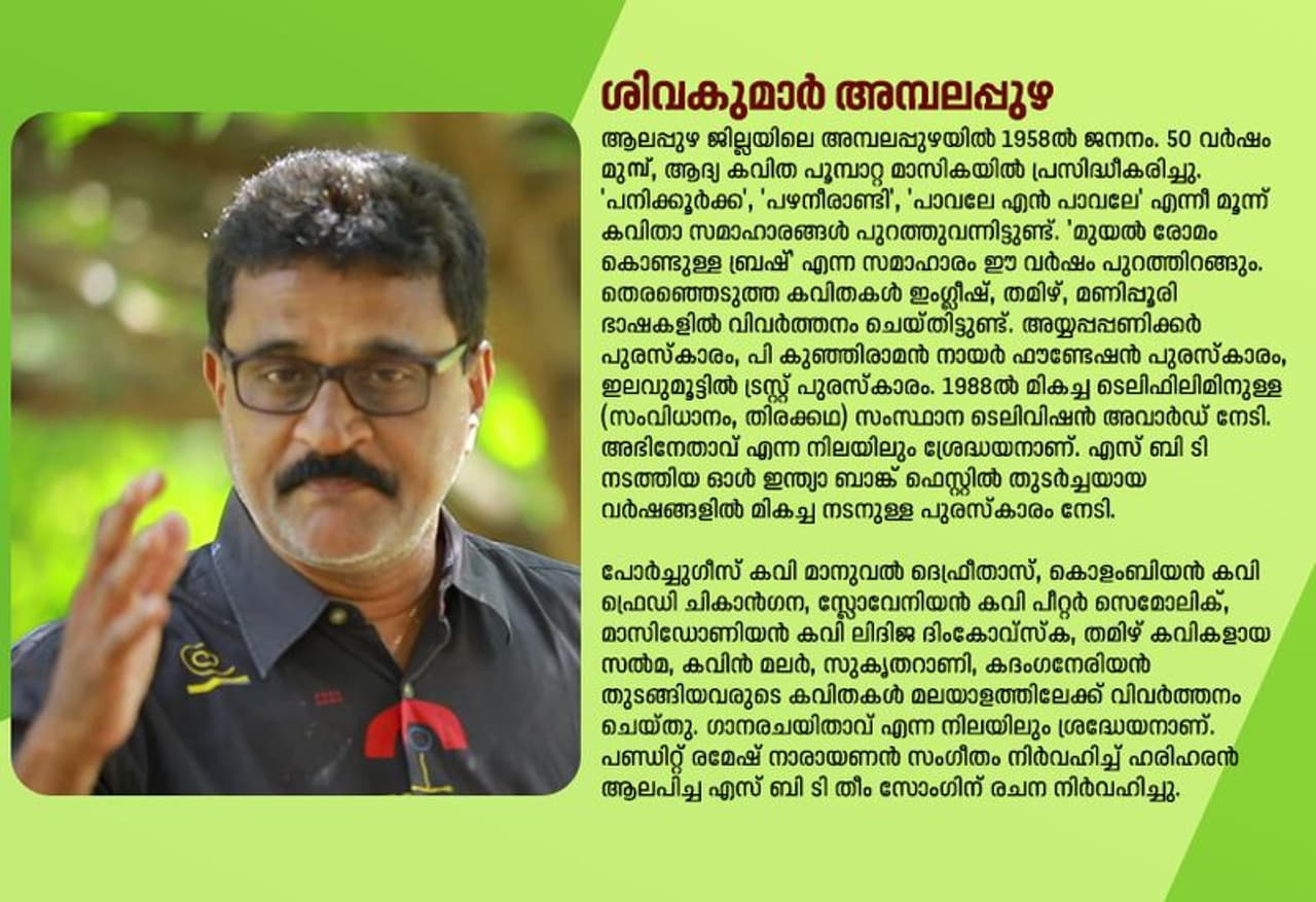 പണിയറിയാവുന്നൊരു വാക്കിന്റെ തച്ചന് പില്ക്കാലങ്ങള്ക്കായി പണിതുവെയ്ക്കുന്ന ശില്പ്പങ്ങളുടെ സവിശേഷചാരുതയാണ് ശിവകുമാര് അമ്പലപ്പുഴയുടെ കവിതകള്ക്ക്.അത്ര കൃത്യം. അത്ര സൂക്ഷ്മം. അരികുകളില്, അറ്റുപോവുന്നത്ര മൂര്ച്ച. ഓരോ വായനയ്ക്കും പലതാവുന്ന കവിതയുടെ ആകാശക്കാറുകള്. കാടും പടലും കളഞ്ഞ വാക്കിന്റെ ശില്പ്പഭദ്രത കവിതയുടെ ഉടല് പിന്നെയും കൂര്പ്പിച്ചുവെയ്ക്കുന്നു. അതില് കണ്ണുവെയ്ക്കുമ്പോള്, വായനയില് സാദ്ധ്യതകളുടെ പല വഴികള് തുറക്കുന്നു. ഒരൊറ്റ ബിന്ദുവില്നിന്നും പലകാലങ്ങള് ഇരമ്പുന്നു. ചേര്നിലങ്ങളില്നിന്ന് അനുഭവങ്ങള് മുളപൊട്ടുന്നു. കടലും കായലും പിണയുന്ന രാനിലാവിന്റെ നിശ്ശബ്ദത തെഴുക്കുന്നു. നാട്ടുപാട്ടിന്റെ, പാടവരമ്പിന്റെ, വിയര്പ്പുമെഴുകിയ ഉടലുകളുടെ, സ്വപ്നം പെരുക്കുന്ന താളങ്ങളുടെ ശ്വാസവേഗങ്ങള് നിറഞ്ഞുതുളുമ്പുന്നു.