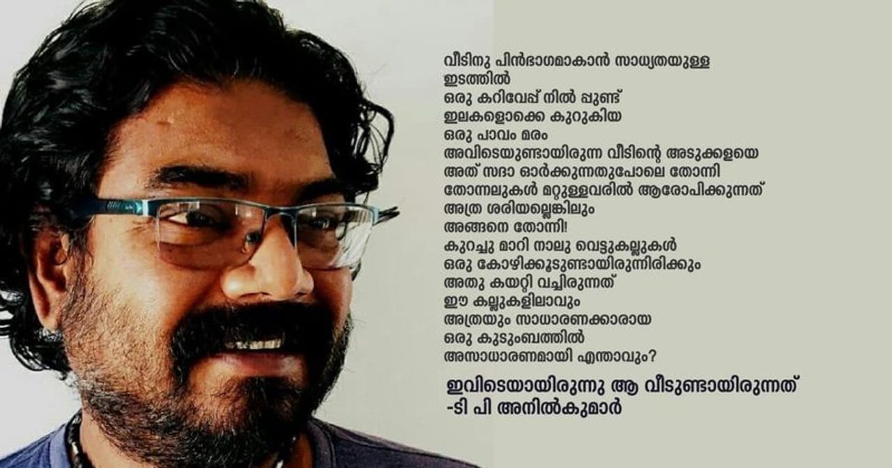 ഭൂതകാലത്തു നിന്നും വസ്തുലോകത്തെ ഖനനം ചെയ്തെടുക്കുന്നതാണ് ലക്ഷ്മിയുടെ ഈ കവിതയെങ്കില് നിലനില്ക്കുന്ന വസ്തുക്കളില് ഭൂതകാലത്തെ കണ്ടെത്തുന്ന കവിതയാണ് ടി പി അനില്കുമാറിന്റെ ഇവിടെയായിരുന്നു ആ വീടുണ്ടായിരുന്നത്' എന്ന കവിത.