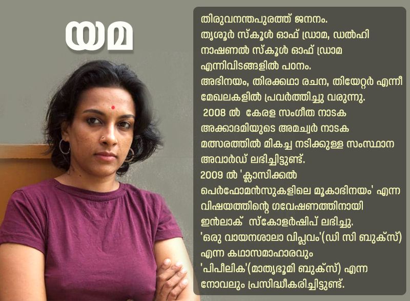 പെണ്ണുങ്ങള് മാത്രം ഓടിക്കുന്ന വണ്ടികളാണ് യമയുടെ കഥകള്. അത് ആണ്കോയ്മയുടെ ഊതിവീര്പ്പിച്ച മതിലുകളിലേക്ക് ചെന്നു കയറുന്നു. ജാതിബോധത്തിന്റെ മേല്മീശ പിരിച്ച് നെഞ്ചുംവിരിച്ചു നടക്കുന്ന കോമാളിത്തങ്ങളുടെ നേര്ക്ക് ബ്രേക്കു പൊട്ടിയ പാച്ചിലാവുന്നു. അലക്കിത്തേച്ച മാന്യതയുടെ വെളുത്ത നെഗളിപ്പുകള് പകയോടെ ഇടിച്ചു വീഴ്ത്തുന്നു. രാഷ്ട്രീയവും സംസ്കാരവും സാമൂഹ്യ ബോധവും കൊണ്ട് കെട്ടിപ്പൊക്കിയ ആണത്ത ഏമ്പക്കങ്ങളെ ഒരു മടിയുമില്ലാതെ ആകാശങ്ങളിലേക്ക് പറത്തുന്നു. പാട്രിയാര്ക്കിയുടെ കാറ്റു വീണു മുളച്ച, മസിലുപിടിയന് ദാര്ശനികതകളെ ഒറ്റക്കുത്തിന് കൊല്ലുന്നു. ആണുങ്ങള്ക്കു മാത്രമായുണ്ടാക്കിയ സാമൂഹിക നിലകളിലേക്ക് കൊടുങ്കാറ്റു പോലെ കുതിക്കുന്നു.