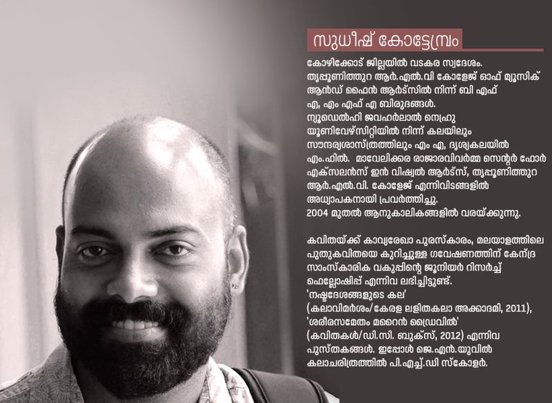 ചിത്രവും കവിതയും. രണ്ട് വ്യത്യസ്തമായ വഴികളെന്ന് ഒറ്റ നോട്ടത്തില് തോന്നാം. എന്നാലത്, ഒരേ മരത്തിന്റെ വേരുകള് മാത്രമെന്ന് പറയും, സുധീഷ് കോട്ടേമ്പ്രം. സുധീഷിനത് പറയാം. കാരണം, സുധീഷ് പാര്ക്കുന്ന ഇടങ്ങളാണത്. പഠിച്ചതും മുഴുകിയതും ചിത്രകലയിലാണ്. എഴുതിയതും നടന്നതും കവിതയിലും. (എന്നിട്ടും കഥയാണ് കൂടുതലിഷ്ടമെന്ന് പറഞ്ഞുവെക്കുന്നുണ്ട്, ഒരഭിമുഖത്തില് സുധീഷ് ). സുധീഷ് ചിത്രം വരയ്ക്കുക മാത്രമല്ല, കലാനിരൂപണം എന്ന് പറയുന്ന പതിവുവഴിയ്ക്കുമപ്പുറം, എങ്ങനെയാണ് കല സൗന്ദര്യശാസ്ത്രപരവും രാഷ്ട്രീയവുമായി, ജീവിക്കുന്ന പരിസരങ്ങളുമായി ചേര്ന്നു നില്ക്കുന്നത് എന്നാരായുന്നുമുണ്ട്. കവിതയില് നടക്കുമ്പോഴും സുധീഷ് ഇതേ സന്ദേഹത്തിനു പിന്നാലെ പോവുന്നുണ്ട്.