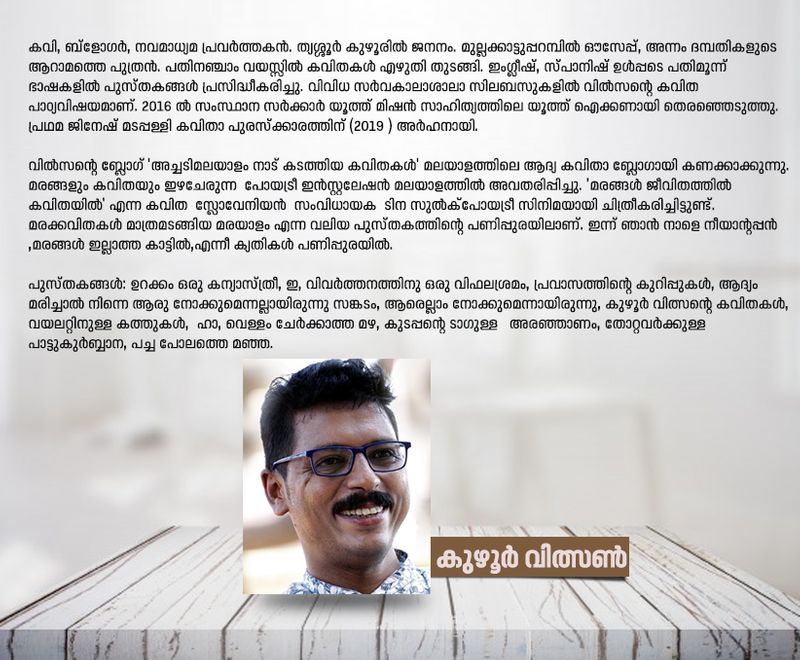 അടിമുടി കവിത പൂത്തൊരു മരം. കവിതകള്ക്കകത്തും പുറത്തുമുള്ള കുഴൂര് വില്സന്റെ ജീവിതത്തിന്റെ ടാഗ് ലൈന് അതാണ്. ഭൂമിയെ കവിത കൊണ്ട് തൊടുന്നൊരാള്. ചുറ്റുപാടുമുള്ള ലോകത്തോട് സംവദിക്കാന് കവിതയുടെ ഭാഷമാത്രം സ്വന്തമായുള്ള ഒരാള്. അത്തരം ഒരാള്ക്കു മാത്രം പറയാനാവുന്ന കാര്യങ്ങളാണ് കുഴൂര് വില്സന് കവിതകള്. അയാള് കാണുന്നതിലും തൊടുന്നതിലെല്ലാം കവിതയുടെ വിത്തുകള് വീണുകിടക്കുന്നത് അതാണ്. മണ്ണിലേക്കു വേരിറങ്ങിയ, ആകാശത്തോളം ചില്ലകളും ഇലകളും പടര്ന്നു കിടക്കുന്ന ഒരു വനമായി കുഴൂര് കവിതകള് മാറുന്നതും അതിനാലാണ്. മരങ്ങള്ക്ക് സഹജമായ വ്യത്യസ്തതകള് തന്നെയാണ് കുഴൂര് കവിതകളുടെ വേറിട്ട നില്പ്പ് സാദ്ധ്യമാക്കുന്നതും.