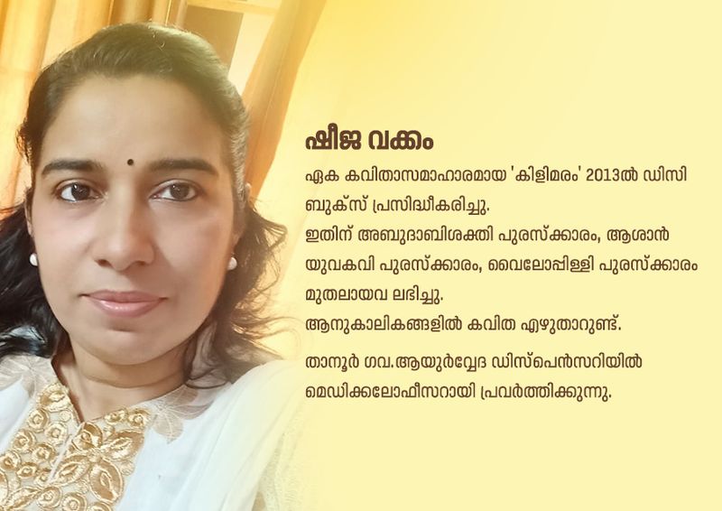 ഓര്മ്മകളില് വേരാഴ്ത്തിയ മരം അതിന്റെ ആവാസവ്യവസ്ഥകളെ തിരിച്ചുപിടിക്കാന് നടത്തുന്ന യാത്രകളാണ്, ഒറ്റ നോട്ടത്തില് ഷീജ വക്കം എഴുതിയ കവിതകള്. എന്നാല്, സൂക്ഷിച്ചുനോക്കുമ്പോള് അതുമാത്രമല്ല. ഇതുപോലൊരു കാലത്ത് ജീവിക്കുന്ന ഒരു മനുഷ്യന് സൂക്ഷ്്മമായി സ്വയം ആവിഷ്കരിക്കുന്നതിന്റെ എല്ലാ അലയനക്കങ്ങളും അവിടെ കാണാം. അതിന് അടിനൂലായി കിടക്കുന്നത്, ഭൂതഭാവി വര്ത്തമാനങ്ങള് പിണഞ്ഞുകിടക്കുന്ന ഭാവനയുടെ സൂക്ഷ്മമായ അടരുകളാണ്. അവിടെ മനുഷ്യര് മാത്രമല്ല, ഭൂലോകത്തെ സകല ജീവജാലങ്ങളും ഉള്ച്ചേര്ന്നു കിടക്കുന്നു. പാരിസ്ഥിതികമായ മിടിപ്പുകള് അതിന് ആന്തരിക ശ്രുതിയാവുന്നു. കവിതയുടെ മഹാപാരമ്പര്യത്തില്നിന്നും ഊര്ജം കൈവരിച്ചൊഴുകുമ്പോഴും സമകാലികാവസ്ഥകളെ അത് തീവ്രമായി പുല്കുന്നു. ഭാഷയിലും ആഖ്യാനത്തിലും ഒരേ കൈവഴിയിലൂടെ സഞ്ചരിക്കുമ്പോഴും നവഭാവുകത്വങ്ങളെ ഒപ്പം വഹിക്കുന്നു. സൂക്ഷ്മമായ വിതാനങ്ങളെ സ്വയം ആവിഷ്കരിക്കുന്നു.