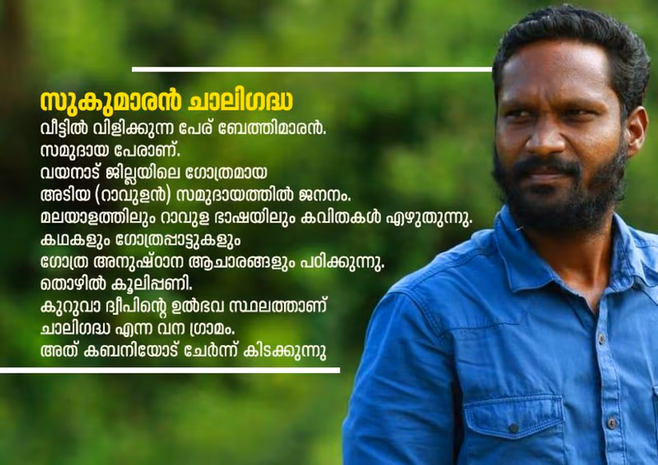 മലയാള കവിതയുടെ പുതിയ ഊര്ജ സ്രോതസ്സാണിപ്പോള് ഈ ഗോത്രവഴികള്. വിവിധ ഗോത്രവര്ഗങ്ങളില്നിന്നായി നിരവധി ചെറുപ്പക്കാരാണ്, സാമ്പ്രദായിക സാഹിത്യത്തിന് അത്ര പരിചിതമല്ലാത്ത ഭാവുകത്വവും വ്യത്യസ്തമായ കാഴ്ചപ്പാടുകളും തീക്ഷ്ണമായ ചിന്തകളുമായി കടന്നുവരുന്നത്. ഭാഷ കൊണ്ടും സാഹിത്യം കൊണ്ടും ഈ കെട്ട കാലത്തെ മാറ്റിമറിക്കുകയും അതിജീവിക്കുകയുമാണ് ഇവര്. വയനാട്ടിലെ കുറുവ ദ്വീപിനടുത്തുള്ള ചാലിഗദ്ധ ഗ്രാമത്തില്നിന്നുള്ള സുകുമാരന് ചാലിഗദ്ധ എന്ന ബേത്തിമാരന് ആ കൂട്ടത്തിലെ വ്യത്യസ്തമായ ഒരു ധാരയെയാണ് പ്രതിനിധീകരിക്കുന്നത്. മലയാള കവിത കൗതുകക്കണ്ണോടെ ചേര്ത്തുവെയ്ക്കുന്ന 'കാട്്' എന്ന സങ്കല്പ്പം, സുകുമാരന്റെ കവിതയിലെത്തുമ്പോള് മഴക്കാടിന്റെ ഗന്ധം പേറുന്ന ജൈവികമായ ഒരനുഭവമാകുന്നു. കാട്ടിലിടമില്ലാതെ നാട്ടിലേക്കു പായുന്ന മൃഗങ്ങളും മനുഷ്യരും തമ്മിലുള്ള സംഘര്ഷങ്ങളുടെ (Human–wildlife conflict) കാലത്ത്, സുകുമാരന്റെ കവിത പുതിയ ആവാസവ്യവസ്ഥകള് ഗോത്രഭാഷയായ റാവുളയിലും മലയാളത്തിലുമായി സ്വാഭാവികതയുടെ കാടനുഭവങ്ങള് അടയാളപ്പെടുത്തുന്നു. റാവുള ഗോത്രത്തിന്റെ പാട്ടുപാരമ്പര്യവും കാവ്യ പാരമ്പര്യവും പുതു കാലത്തിന് ചേരുംവിധം സ്വാംശീകരിച്ച്, തികച്ചും വ്യത്യസ്തമായ അനുഭവരാശികള് സൃഷ്ടിക്കുന്നു. പ്രകൃതിയാണ് അതിന്റെ ഏറ്റവും പച്ചയായ അര്ത്ഥത്തില് അതില് തുളുമ്പുന്നത്. കാടും നാടും തമ്മിലുള്ള സംഘര്ഷങ്ങളാണ് വരികള്ക്കിടയില് പുകയുന്നത്. ഇടം നഷ്ടപ്പെടുന്ന മൃഗങ്ങളുടെയും മനുഷ്യരുടെയും പരിസ്ഥിതിയുടെയും നിസ്സഹായതയാണ് അവിടെ മുഴങ്ങുന്നത്. ഏതോ ഏറുമാടത്തിലിരുന്ന് പുതിയ കാലത്തെ നോക്കിക്കാണുന്ന കവിതയുടെ ഏകാന്തതയാണ് സുകുമാരന് പകര്ത്തുന്നത്.
