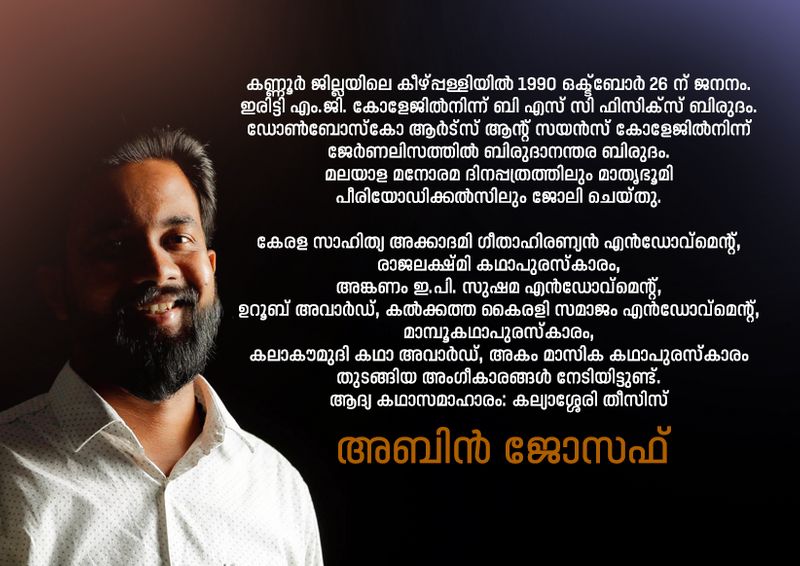 അടക്കമുള്ള വാക്കുകളാണ് അബിന് ജോസഫിന്റെ കഥകളുടെ പ്രത്യേകത. എങ്ങോട്ടും ചിന്നിച്ചിതറിപ്പോകാതെ അതങ്ങനെ സഞ്ചരിക്കുന്നു. പക്ഷേ, അതേസമയം വായനക്കാരന് പലവിധ വൈകാരിക മുഹൂര്ത്തങ്ങളിലേക്ക് ഒളിച്ചുകടത്തപ്പെടുകയും ചെയ്യുന്നു. അതില്നിന്നും മാറിനില്ക്കാന് വായനക്കാരനെ എഴുത്തുകാരനും എഴുത്തും സമ്മതിക്കുന്നേയില്ല. കഥാപരിസരങ്ങളിലൂടെ സഞ്ചരിച്ച്, തിരികെയെത്താനാകാത്തവണ്ണം കുറച്ച് നേരത്തേക്ക് ആ ലോകത്ത് തളച്ചിട്ടിട്ടുപോകും അബിന്റെ കഥകള്. സൗഹൃദങ്ങളും, മനുഷ്യന്റെ ചെറുതെന്ന് തോന്നിക്കുന്നവയെങ്കില്പ്പോലും ജീവനുള്ള കാലത്തോളം അവനെ തൊട്ടുമാത്രം നിന്നുപോരുന്ന ബന്ധങ്ങളും, വൈകാരികമായ സംഘര്ഷങ്ങളുമെല്ലാം അടങ്ങുന്നത് തന്നെയാണ് അബിന് ജോസഫിന്റെ കഥകള്. അപ്പോഴും സമൂഹത്തിലേക്ക് കണ്ണുംമനസ്സും തുറന്നു നോക്കാനും കൃത്യമായ നിലപാടുകള് പുലര്ത്താനും രാഷ്ട്രീയം സംസാരിക്കാനും അത് മടികാണിച്ചിരുന്നുമില്ല.