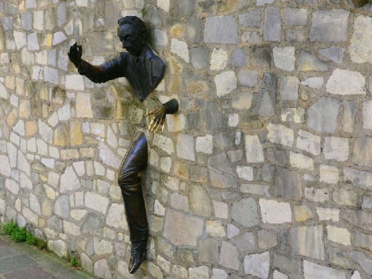 ഫ്രഞ്ച് നടനായ ഴാങ് മറയിസ് ആണ് 1980-കളില് ഈ വെങ്കല ശില്പം രൂപകല്പ്പന ചെയ്ത് സ്ഥാപിച്ചത്. മതിലിനുള്ളില് ഉറഞ്ഞുപോയൊരു മനുഷ്യരൂപമാണിത്. ലോകത്തെ ഏറ്റവും വിചിത്രമായ പ്രതിമകളിലൊന്ന്. മാര്സെല് എയ്മെയുടെ കഥയിലെ നായകനായ ഡ്യുത്തിയേള് വിചിത്രമായ ജീവിതം ജീവിച്ച ഒരാളായിരുന്നു എന്നതു തന്നെയാണ് ഈ പ്രതിമയെ സവിശേഷമാക്കുന്നത്. ചുവരുകളിലൂടെ സഞ്ചരിക്കാന് അസാമാന്യശേഷിയുണ്ടായിരുന്ന ഡ്യുത്തിയേളിന്റെ കഥയാണ് 'ചുവരിലൂടെ നടന്ന മനുഷ്യന്'. ധാരാളം സിനിമകള്ക്ക് വേണ്ടി കഥയെഴുതിയെങ്കിലും മരണശേഷം പുറത്തുവന്ന ഈ പ്രതിമയാണ് മാര്സെല് എയ്മെയെ പില്ക്കാലത്തേക്ക് സജീവമായി നിര്ത്തിയത്.
