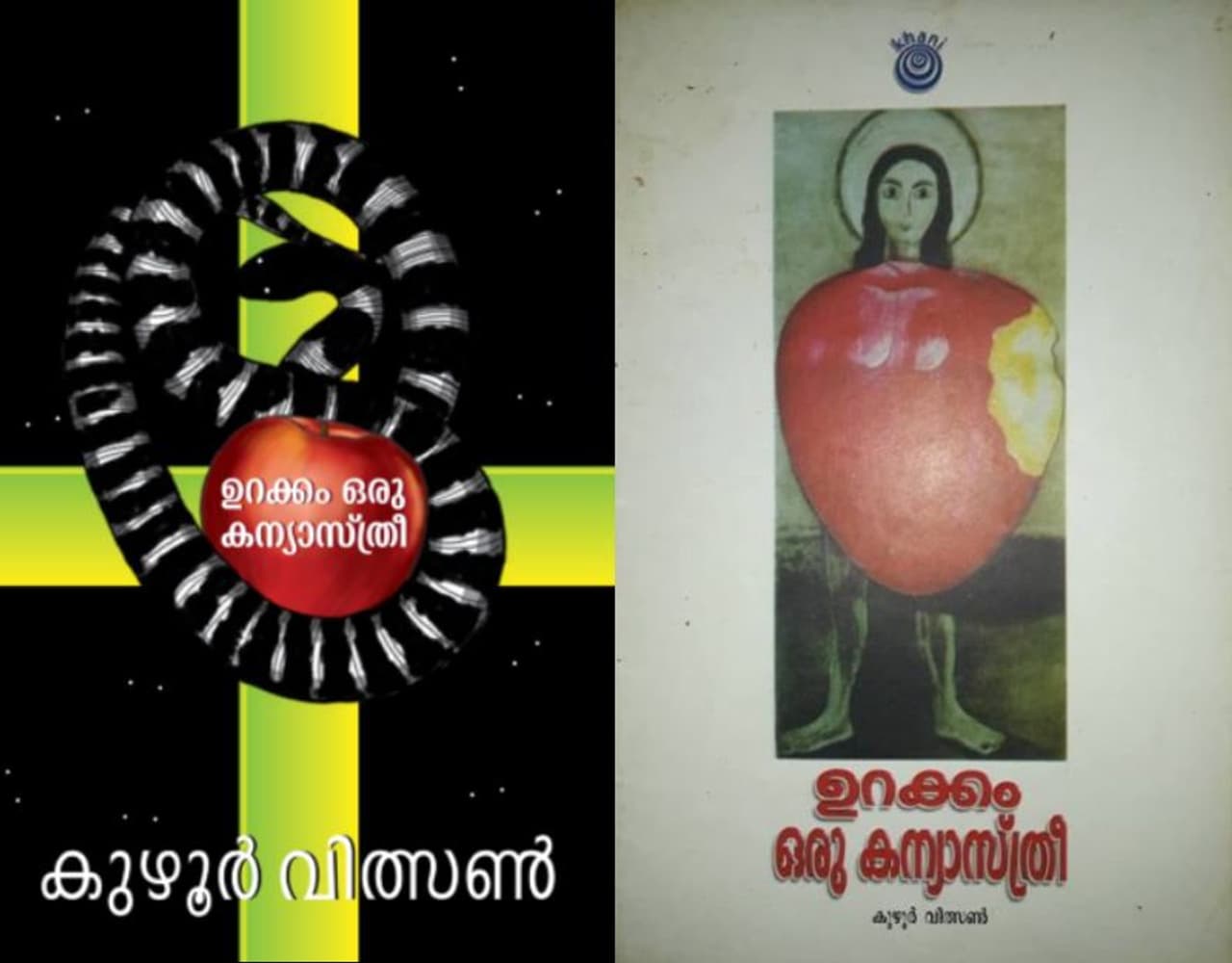 ഉറക്കം ഒരു കന്യാസ്ത്രീ. കുഴൂര് വില്സന്റെ ആദ്യ പുസ്തകത്തിന്രണ്ട് കാലങ്ങളില് ഇറങ്ങിയ രണ്ട് പതിപ്പുകളുടെ കവര് ചിത്രങ്ങള്.