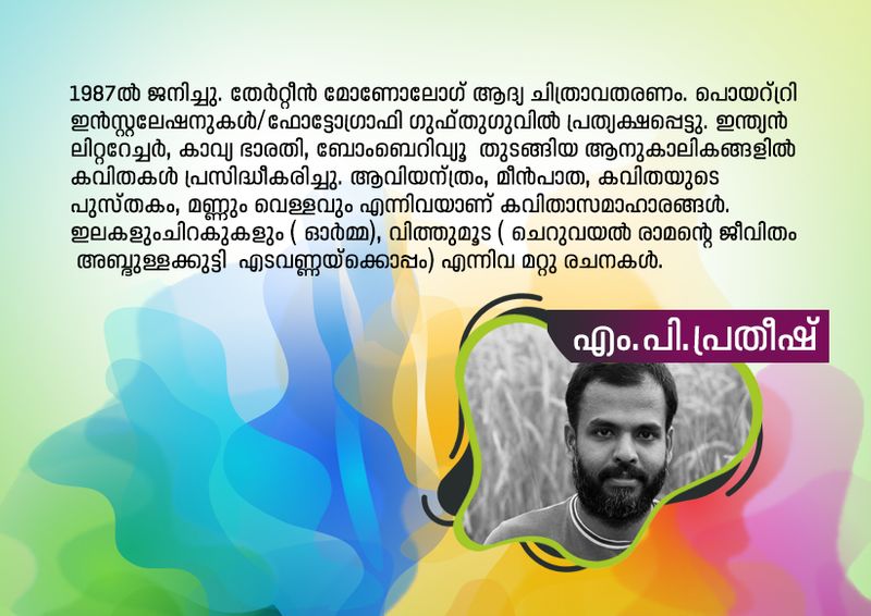 പുതു മലയാള കവിതയിലെ ഏറ്റവും വ്യത്യസ്തമായ അടരുകളിലൊന്നാണ് എം പി പ്രതീഷിന്റെ കവിതകള്. പ്രകൃതിയെ, ഭൂമിയെ, ആവാസവ്യവസ്ഥകളെ കവിതയുടെ സൂക്ഷ്മദര്ശിനികളിലൂടെ തിരയുകയാണ് ആ കവിതകള്. പുതിയ കാലത്തിന്റെ ആരവങ്ങളല്ല, ജീവിതാഘോഷങ്ങള്ക്കിടയില് ആരുടെയും കണ്ണുപതിയാതെ പോവുന്ന ഇടങ്ങളും അനുഭവങ്ങളുമാണ് പ്രതീഷിന്റെ കവിതകള് വിനിമയം ചെയ്യുന്നത്. ശാന്തമായ, സൗമ്യമായ കവിതയ്ക്കു മാത്രം ചെന്നെത്താനാവുന്ന ആഴമേറിയ ഒരനുഭവമാണത്. വായനക്കാരുടെ ശ്രദ്ധയെ ആവോളം ആവശ്യപ്പെടുന്ന, ആവാഹിക്കുന്ന കവിതയുടെ വേറിട്ട ഇടം. സൂക്ഷ്മനിരീക്ഷണങ്ങള്, അസാദ്ധ്യമായ ആംഗിളുകളില്നിന്നുള്ള നോട്ടങ്ങള്, ആഖ്യാനത്തിന്റെ ഉപരിതലത്തിലേക്ക് ജീവിതത്തെ ഇഞ്ചിഞ്ചായി വിളിച്ചുവരുത്തുന്ന രചനാതന്ത്രങ്ങള്. പ്രതീഷിന്റെ കവിതകള് ശ്രദ്ധേയമാവുന്നത് ഈ വഴിക്കാണ്.