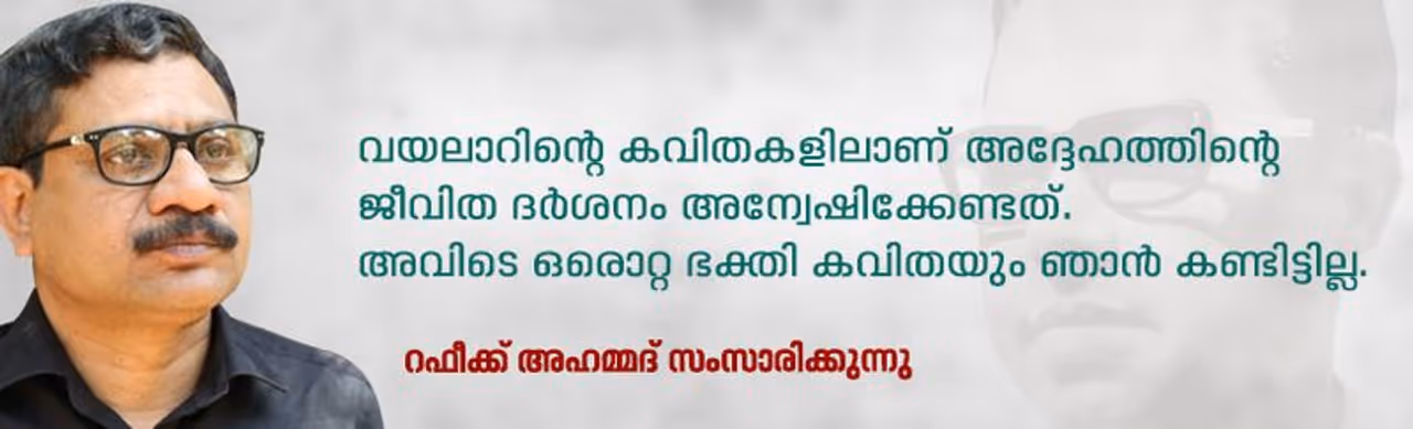 സമകാലിക മലയാള ചലച്ചിത്രഗാനരചനയിൽ ഇന്നും കവിതയുടെ മുഗ്ദ്ധസൗന്ദര്യത്തെ ആവാഹിച്ചുപിടിക്കുന്ന അപൂർവം പാട്ടെഴുത്തുകാരിൽ ഒരാളാണ് കവി റഫീക്ക് അഹമ്മദ്. തോരാമഴ, പ്രണയമില്ലാതെയായ നാൾ തുടങ്ങിയ നിരവധി മനോഹരമായ കവിതകളിലൂടെ മലയാളികളെ സ്വാധീനിച്ചിട്ടുള്ള റഫീക്ക് അഹമ്മദ് മലയാളികൾ എന്നുമോർത്തിരിക്കുന്ന നിരവധി ചലച്ചിത്രഗാനങ്ങളും രചിച്ചിട്ടുണ്ട്. വയലാർ രാമവർമയുടെ ഗാനങ്ങളോട് മാനസികമായി ഏറെ അടുപ്പം സൂക്ഷിക്കുന്ന റഫീക്ക് അഹമ്മദുമായി വയലാറിന്റെ ഓർമദിവസത്തിൽ ബാബു രാമചന്ദ്രൻ നടത്തിയ അഭിമുഖം.