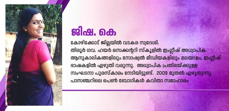Read more: തിരികെ നടക്കുമ്പോള്, ജിഷ കെ എഴുതിയ കവിതകള്