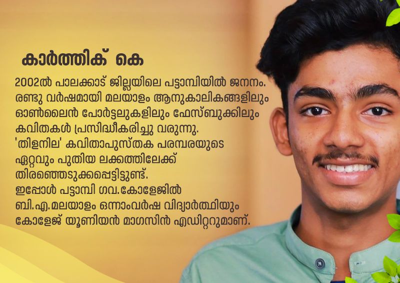 അതിസാധാരണമായ ജീവിത മുഹൂര്ത്തങ്ങളിലും കവിതയുടെ വിത്തുകള് കണ്ടെടുക്കുന്ന ഒരു യാത്രികന് ചെന്നുപെടുന്ന സ്വാഭാവിക ഇടങ്ങളാണ് കാര്ത്തിക്കിന്റെ കവിതകള്. പ്രാതലിലെ ചായയും ചേച്ചിയുടെ പല്ലിലിട്ട കമ്പിയും വിറകാക്കാന് കിട്ടിയ ഓലമടല് ക്രിക്കറ്റ് ബാറ്റായി മാറുന്ന പരിണാമവും വഴിചോദിക്കാതെ വീട്ടിലെത്തിയ ഓറഞ്ചുമെല്ലാം ഒളിപ്പിച്ചുവെയ്ക്കുന്ന നിത്യജീവിതപ്പഴക്കങ്ങളില്നിന്ന് കവിത മെനയുന്ന ശില്പ്പചാതുരിയാണത്. ശ്വാസം കഴിക്കുന്നതുപോലെ സ്വാഭാവികമാണ് ആ പിറവി. നിത്യജീവിതത്തെ കവിത കൊണ്ട് പൂരിപ്പിക്കാനുള്ള ഈ നടത്തങ്ങളാണ്്, വിദ്യാര്ത്ഥിയായ കാര്ത്തിക്കിനെ മലയാള കവിതയുടെ ഏറ്റവും പുതിയതും വ്യത്യസ്തവുമായ സ്വരങ്ങളിലൊന്നായി മാറ്റുന്നത്. കാവ്യ ചരിത്രത്തിലും എഴുത്തു പാരമ്പര്യത്തിലും വേരാഴ്ത്തി വളരുന്ന നാട്ടുചെടിത്തഴപ്പാണ് ആ കവിതകളുടെ മേലാപ്പ്. സൂക്ഷ്മമായ ജീവിത നിരീക്ഷണവും അസാധാരണമായ താളബോധവും പ്രായത്തെ വെല്ലുന്ന കാവ്യാവബോധവും കൊണ്ടാണ്, സമകാലീനതയെ കാര്ത്തിക് നേരിടുന്നത്.