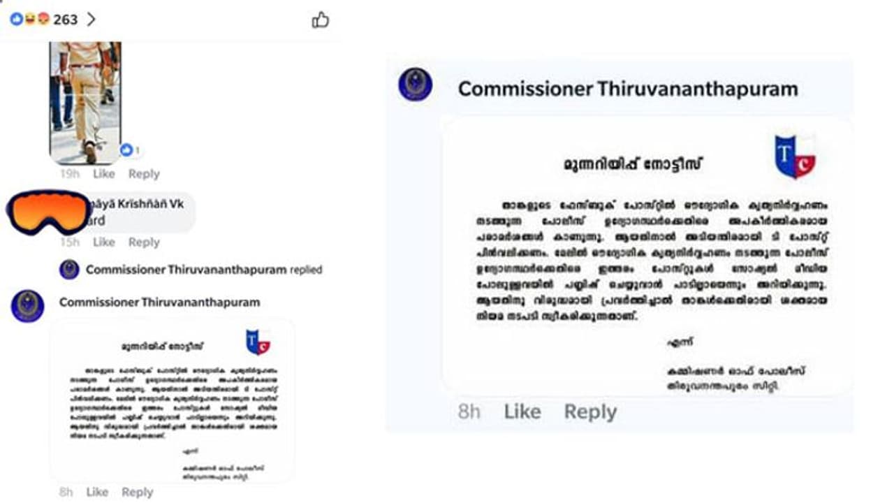 പൊലീസിനെതിരെ സാമൂഹ്യ മാധ്യമങ്ങളില് അധിക്ഷേപകരമായ കമന്റുകളിടുന്നവര്ക്കെതിരെ നടപടിയുമായി പൊലീസ്. പൊലീസിനെതിരെയുള്ള പോസ്റ്റുകള്ക്ക് കീഴെ തിരുവനന്തപുരം സിറ്റി പൊലീസ് കമ്മീഷണറുടെ പേരിലുള്ള പേജില് നിന്നാണ് മുന്നറിയിപ്പ് പോസ്റ്റ് വന്നിരിക്കുന്നത്.