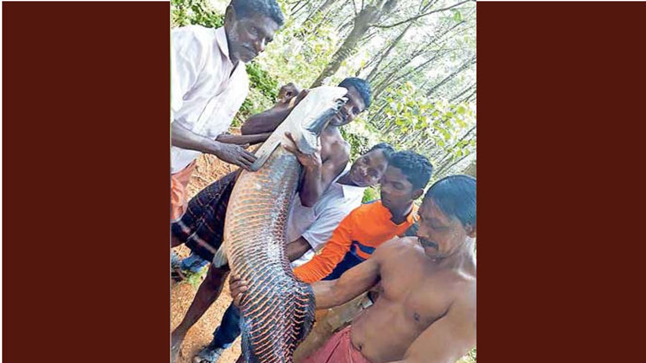 58 കിലോ തൂക്കമുള്ള മത്സ്യമാണ് ഇടുക്കി മുട്ടം പെരുമുറ്റത്ത് ചൂണ്ടയില് കുടുങ്ങിയത്. അരപൈമ എന്ന മത്സ്യമാണ് ചൂണ്ടയില് കുടുങ്ങിയത്.