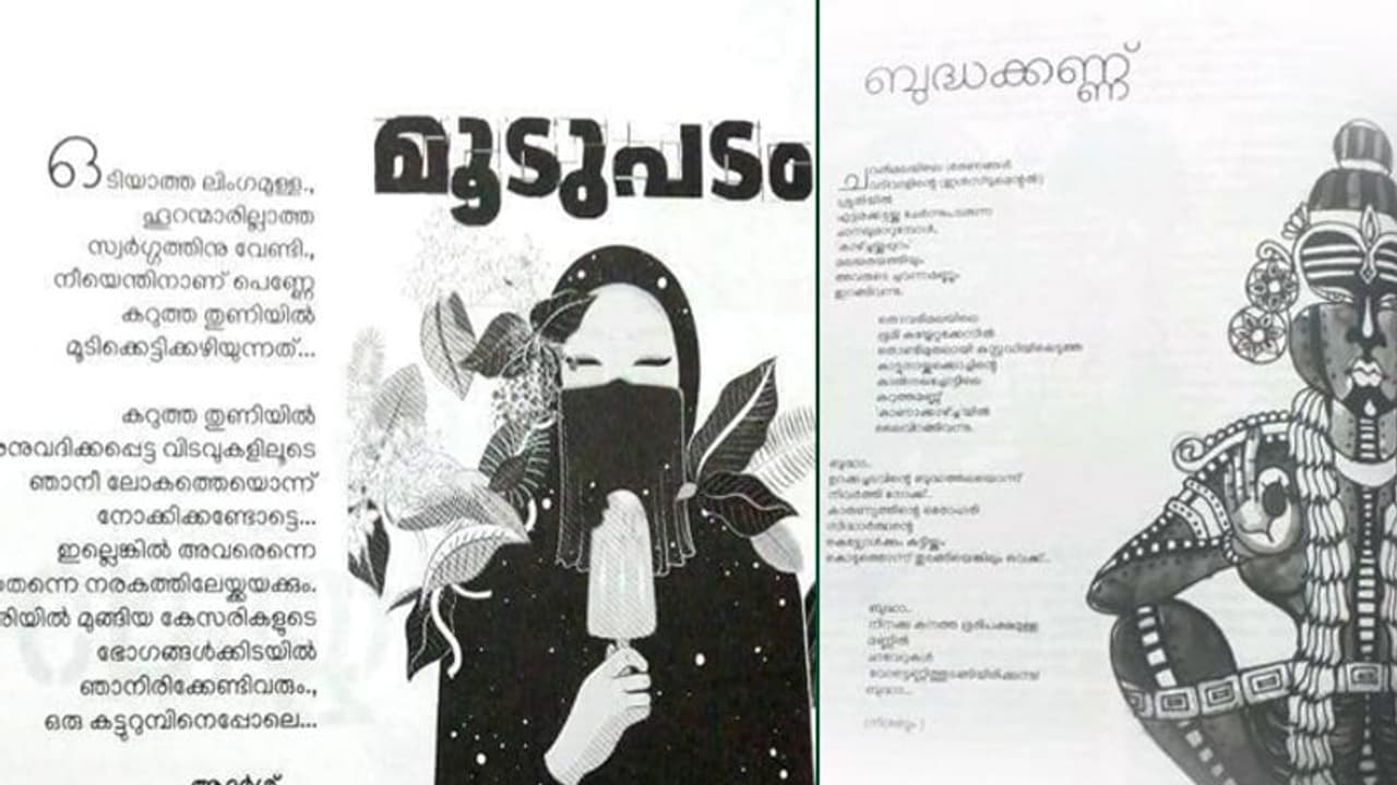 മാഗസിനില് പ്രസിദ്ധീകരിച്ച മൂടുപടം എന്ന കവിത ഇസ്ലാം മതത്തേയും ബുദ്ധക്കണ്ണ് എന്ന കവിത ശബരിമലയേയും അപമാനിക്കുന്നതാണെന്നാണ് പ്രതിഷേധക്കാരുടെ അവകാശവാദം. മാഗസിനില് പ്രധാനമന്ത്രി നരേന്ദ്ര മോദിക്കെതിരായും പരാമര്ശങ്ങളുണ്ടെന്നും എബിവിപി ആരോപിക്കുന്നു.