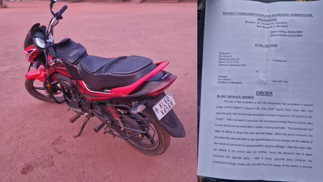 ഉദുമ സ്വദേശി വാങ്ങിയ ഹീറോ പാഷൻ പ്ലസ് പ്രോ ബൈക്കാണ് വാങ്ങിയ ആഴ്ച തന്നെ തകരാറിലായത്. രണ്ടു വർഷത്തെ നിയമ പോരാട്ടത്തിന് ശേഷം ഗിരീശനെ തേടി അനുകൂല വിധി എത്തിയത്