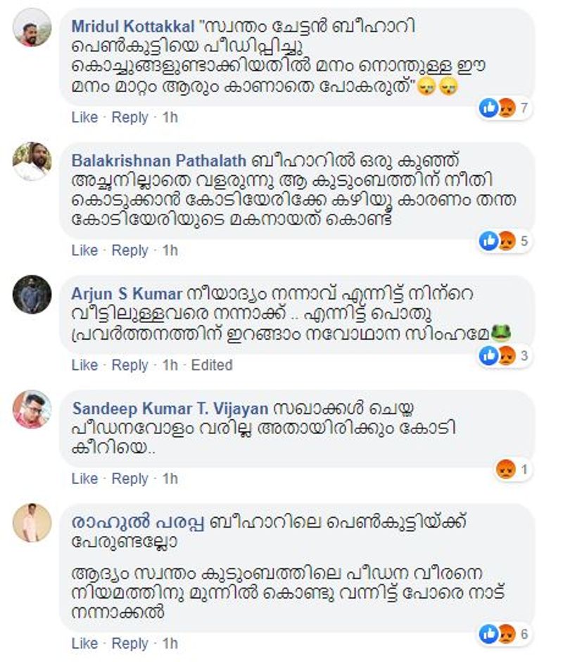 തിരുവനന്തപുരം: ഉത്തർപ്രദേശിലെ ഉന്നാവോയിൽ ബലാത്സംഗത്തിനിരയായ പെൺകുട്ടി സഞ്ചരിച്ചിരുന്ന കാർ അപകടത്തിൽപ്പെട്ട സംഭവത്തില് കുട്ടിക്ക് ഐക്യദാര്ഢ്യവുമായി പോസ്റ്റിട്ട ബിനീഷ് കൊടിയേരിക്ക് ഫേസ്ബുക്കില് പൊങ്കാല. 'ആദ്യം കുടുംബത്തിലെ പ്രശ്നങ്ങള് പരിഹരിക്കൂ എന്നിട്ടാകാം നാട് നന്നക്കുന്നതെന്നാണ് ' ബിനീഷ് കൊടിയേരിക്കെതിരായ പ്രധാന ആരോപണം.