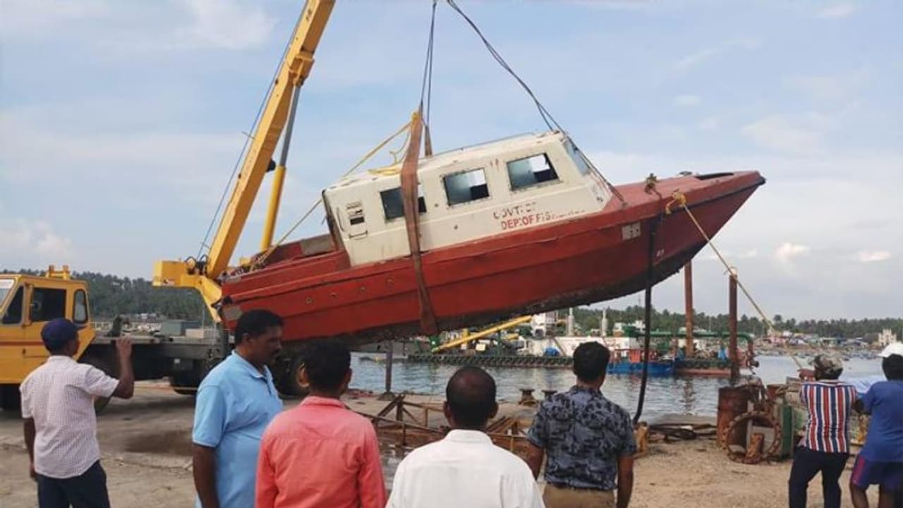 വിഴിഞ്ഞം മത്സ്യബന്ധന തുറമുഖത്ത് വെള്ളം കയറി മറിഞ്ഞ കൂറ്റൻ ടഗ്ഗിൻറെ അടിയിൽപ്പെട്ട് കിടന്ന മറൈൻ എൻഫോഴ്സ്മെൻറിൻറെ പട്രോൾ ബോട്ട് പുറത്തെടുത്ത് കരയിലേക്ക് മാറ്റി. ഇന്നലെ ഉച്ചയോടെ തുറമുഖ വകുപ്പിലെ ജീവനക്കാരെത്തിയാണ് പട്രോൾ ബോട്ട് ടഗ്ഗിനടിയിൽ നിന്നും പുറത്തെടുത്ത് കരയിലേക്ക് മാറ്റിയത്.