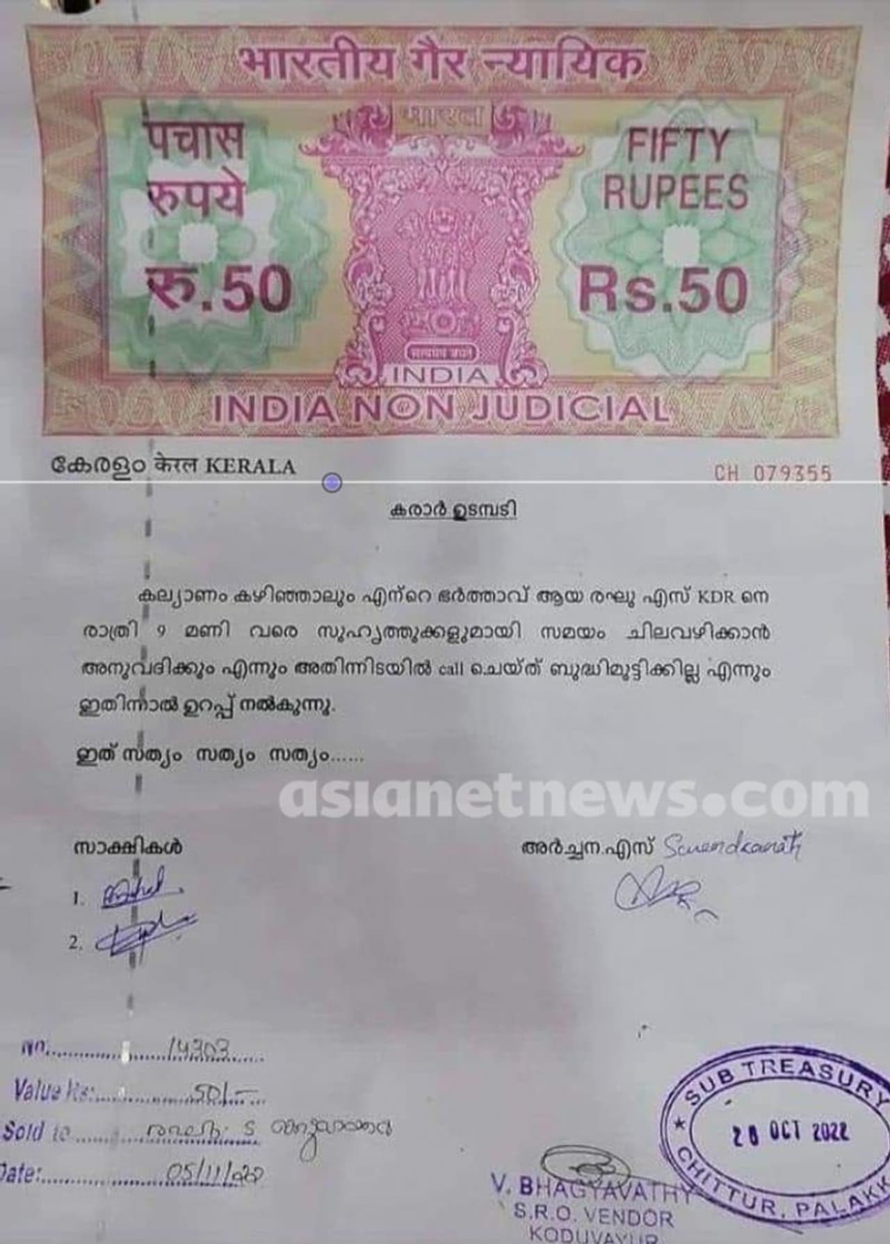 ഇരുവരുടെയും വിവാഹത്തിന് പിന്നാലെ രഘുവിന്റെ കൂട്ടുകാര് സാമൂഹിക മാധ്യമങ്ങളില് പങ്കെവച്ച വിവാഹ ഉടമ്പടിയാണ് തരംഗമായത്.