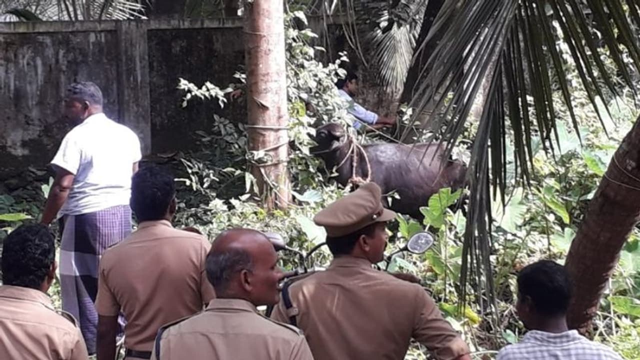 ഫയർസ്റ്റേഷനിൽ ഓഫീസർ പി വി പ്രേംനാഥിന്റെയും ലീഡിംഗ് ഫയർമാൻ ടി എം പവിത്രൻ അരൂർ പൊലീസും മറ്റ് രണ്ടുപേരും കൂടി എത്തി പോത്തിനെ തളച്ചു. തമിഴ്നാട്ടിൽ നിന്ന് അറുക്കുന്നതിനായി ലോറിയിൽ കൊണ്ടു പോയ പോത്ത് കയറ് പൊട്ടിച്ച് ലോറിയിൽ നിന്ന് ചാടിയതാകാമെന്ന് കരുതുന്നു. പൊലീസ് സ്റ്റേഷന്റെ പിൻഭാഗത്ത് കെട്ടിയിട്ടിരിക്കുകയാണ് പോത്തിനെ. ഉടമകൾ ആരും തന്നെ എത്തിയിട്ടില്ല. തമിഴ്നാട്ടിൽ നിന്ന് ലോറിയിൽ കൊണ്ടുവരുന്ന മൃഗങ്ങളെ ആവശ്യമായ സുരക്ഷാ ക്രമീകരണങ്ങളില്ലാതെയാണ് കേരളത്തിലെത്തിക്കുന്നത്. ഇതിനുമുൻപും ഇതുപോലെ ലോറിയിൽ നിന്ന് ചാടിയ പോത്ത് പരിഭ്രാന്തി സൃഷ്ടിച്ചിട്ടുണ്ട്.
