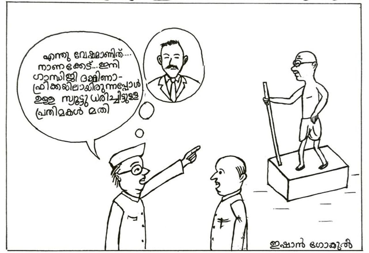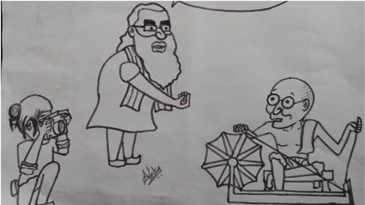 മറ്റൊരു കാർട്ടൂണിൽ ചർക്കയ്ക്ക് അടുത്തിരിക്കുന്ന ഗാന്ധിജിയോട് നരേന്ദ്ര മോദി ചോദിക്കുന്നു, 'ഒന്നു മാറാമോ? ഒരു ഫോട്ടോ എടുക്കാനാണ്..'കാർട്ടൂണുകളിൽ പൂട്ടിയിട്ട രാജ്യവും ഓക്സിജൻ സിലിണ്ടറും ഗാന്ധിജിക്കൊപ്പം കഥാപാത്രങ്ങളാകുന്നു...