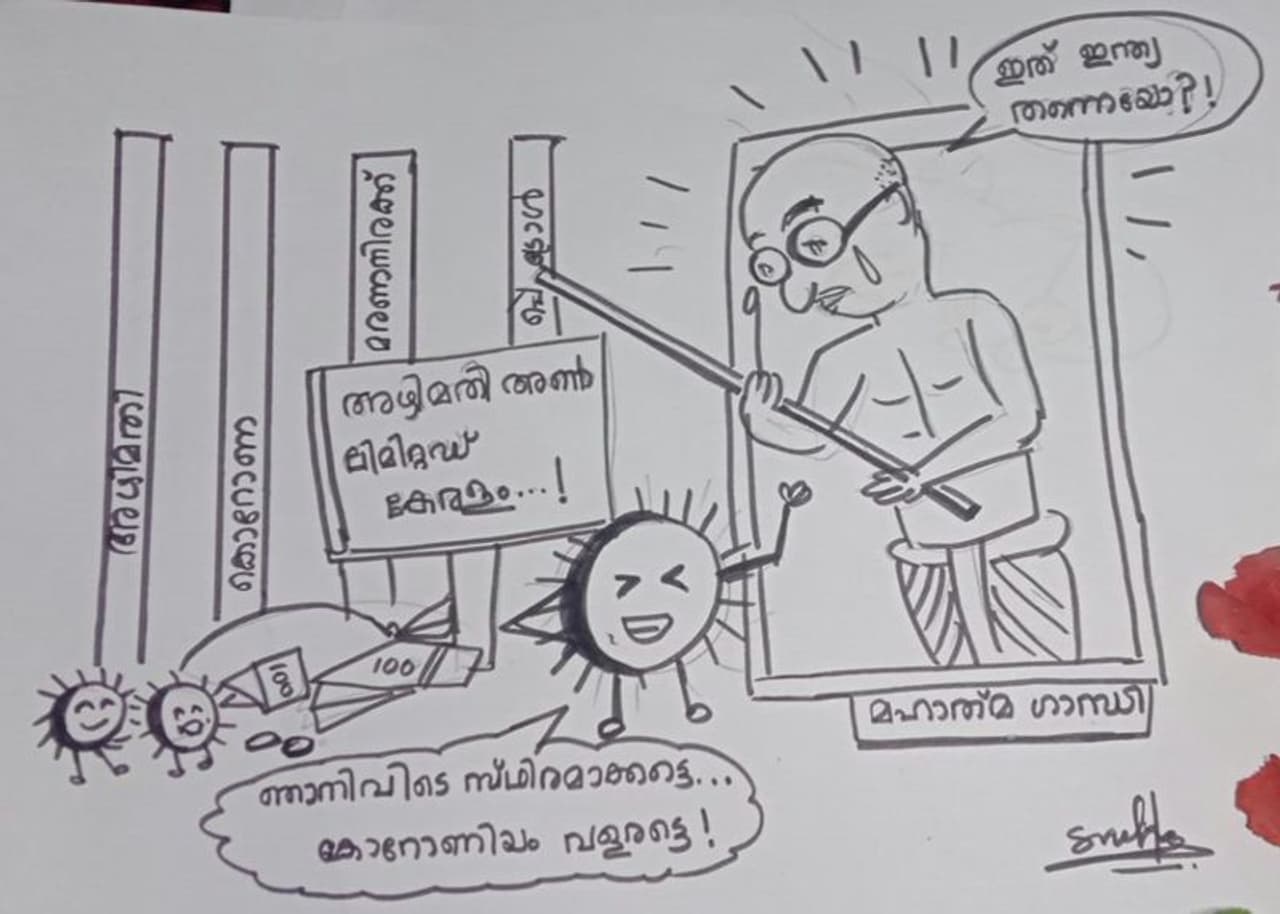 ഒരു കാർട്ടൂൺ ഇങ്ങനെയാണ്: അഴിമതി, കൊറോണ, മരണ നിരക്ക്, പെട്രോൾ വില എല്ലാം കുതിക്കുന്ന നാട്. ചിത്രത്തിലെ ഗാന്ധിജി സങ്കടത്തോടെ പറയുന്നു, ' ഇത് ഇന്ത്യ തന്നെയോ...' കൊറോണ ചിരിച്ചുകൊണ്ട് പറയുന്നു, 'ഞാനിവിടെ സ്ഥിരമാകട്ടെ. കൊറോണീയം വളരട്ടെ...' - അഴിമതി അൺലിമിറ്റഡ് കേരളം എന്നാണ് കുട്ടി ഈ കാർട്ടൂണിന് തലക്കെട്ട് നൽകിയിരിക്കുന്നത്.