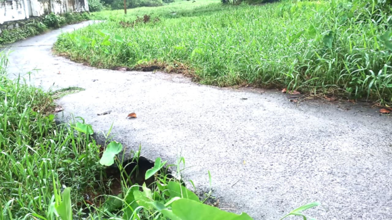 ഏഴുവർഷം മുൻപ് നിർമിച്ച കോൺക്രീറ്റ് റോഡിന്റെ അടിഭാഗത്തെ മണ്ണ് ഒലിച്ചു പോയി. നിരവധിപ്പേർക്ക് ആശ്രയമായ റോഡിൽ പതിയിരിക്കുന്നത് വലിയ അപകടം