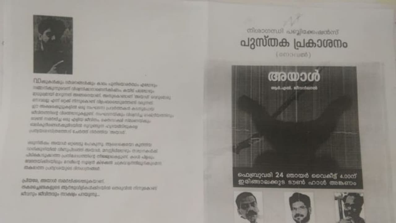 ഡിവൈഎഫ്ഐ ഇരിങ്ങാലക്കുട മുൻ ബ്ലോക്ക് ജോയിന്റ് സെക്രട്ടറി ആർ എൽ ജീവൻലാലിന്റെ പുസ്തക പ്രകാശന ചടങ്ങിലാണ് കോൺഗ്രസ് നേതാക്കൾ പങ്കെടുക്കുന്നത്. നിരൂപകൻ ബാലചന്ദ്രൻ വടക്കേടത്ത് പുസ്തക പ്രകാശനവും, ഡിസിസി ജനറൽ സെക്രട്ടറിയും ഐ ഗ്രൂപ്പ് നേതാവുമായ എം എസ് അനിൽകുമാർ ചടങ്ങില് അധ്യക്ഷനുമാണ്. ചടങ്ങ് വിശദീകരിക്കുന്ന നോട്ടീസിൽ മൂന്ന് പേരുടെയും ചിത്രങ്ങളും ഉള്പ്പെടുത്തിയിട്ടുണ്ട്.