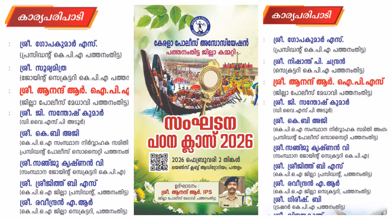 പത്തനംതിട്ട: പത്തനംതിട്ട ജില്ലാ പൊലീസ് അസോസിയേഷൻ പരിപാടിയിൽ നിന്ന് 'വിവാദ സെക്രട്ടറി'യുടെ സ്വാഗത പ്രസംഗം വെട്ടി. പൊലീസ് അസോസിയേഷൻ പത്തനംതിട്ട ജില്ലാ സെക്രട്ടറി നിഷാന്ത് പി ചന്ദ്രന്റെ സ്വാഗത പ്രസംഗത്തിൽ മാറ്റം വരുത്തി പുതിയ നോട്ടീസ് ഇറക്കി. ജില്ലാ പൊലീസ് മേധാവി ഉദ്ഘാടനം ചെയ്യുന്ന ചടങ്ങിൽ നിഷാന്ത് സ്വാഗതം പറയുമെന്നായിരുന്നു നേരത്തെ നിശ്ചയിച്ചിരുന്നത്. ഇത് വ്യക്തമാക്കിക്കൊണ്ട് ആദ്യം തന്നെ നോട്ടീസും പുറത്തിറക്കിയിരുന്നു. എന്നാൽ ഇത് വിവാദമായതോടെ ഉന്നതതല ഇടപെടലിനെത്തുടർന്നാണ് നിഷാന്തിന്റെ സ്വാഗതം പ്രസംഗം വെട്ടിയത്. നിഷാന്തിന്റെ 'സ്വാഗതം' ഒഴിവാക്കി, ജോയിന്റ് സെക്രട്ടറി സൂര്യമിത്രയാകും സ്വാഗതം പറയുകയെന്നാണ് പുതിയ നോട്ടീസ് വ്യക്തമാക്കുന്നത്.