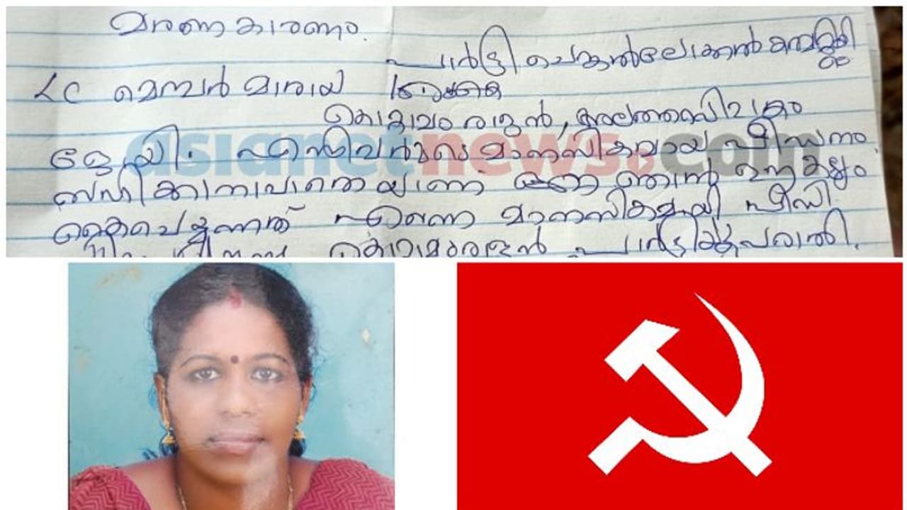 ''സിപിഎം ചെങ്കൽ ലോക്കൽ കമ്മിറ്റി അംഗങ്ങളായ കൊറ്റാമം രാജൻ, അലത്തറവിളാകം ജോയി എന്നിവരുടെ മാനസികമായ പീഡനം സഹിക്കവയ്യാതെയാണ് ഞാൻ ഈ കടുംകൈ ചെയ്യുന്നത്'', എന്നാണ് ആത്മഹത്യാക്കുറിപ്പിലുള്ളത്.