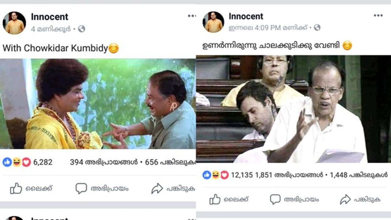 കുമ്പിടി അഥവാ പാലാരിവട്ടം ശശി, നന്ദനം എന്ന സിനിമയിലെ ജഗതിയുടെ ഹിറ്റ് കഥാപാത്രം ട്രോളുകളിലൂടെ ഓൺലൈൻ ലോകത്ത് ഏറെ പ്രശസ്തവുമാണ്. പാര്ലമെന്റില് പി കരുണാകരന് എംപി പ്രസംഗിക്കുമ്പോള് ഇരുന്ന് ഉറങ്ങുന്ന രാഹുല് ഗാന്ധിയും പിന്നില് ശ്രദ്ധയോടെ വീക്ഷിക്കുന്ന ഇന്നസെന്റും ഉള്പ്പെട്ട ചിത്രമാണ് അദ്ദേഹത്തിന്റെ ഫേസ്ക്കില് ഇന്നലെ പോസ്റ്റ് ചെയ്തിരിക്കുന്നത്. 'ഉണര്ന്നിരുന്നു ചാലക്കുടിക്ക് വേണ്ടി' എന്ന അടിക്കുറിപ്പും അതിന് നൽകിയിരുന്നു.