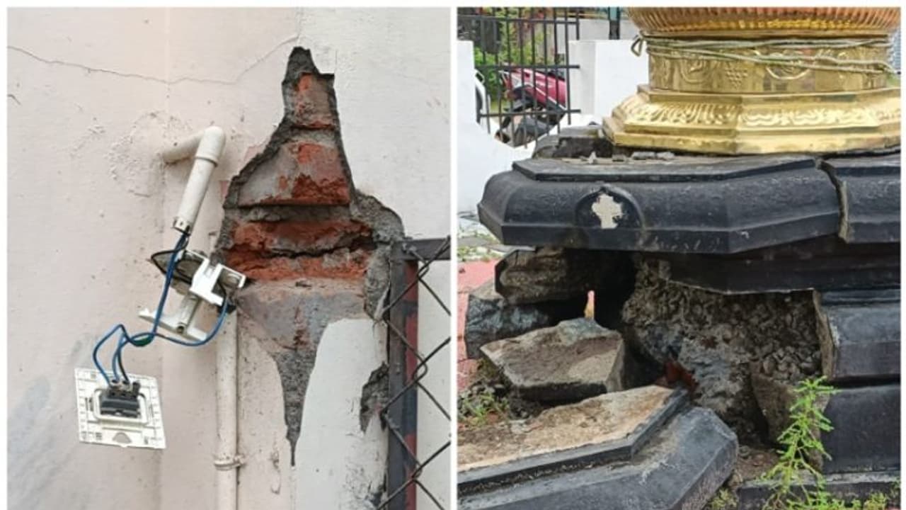 കൊടിമരത്തിന്റെ മുകളിൽ ഇടിമിന്നലേറ്റതിന്റെ ആഘാതത്തിൽ താഴെയുള്ള കൽക്കെട്ട് തകർന്ന് കരിങ്കല്ലുകൾ ഇളകി മീറ്ററുകളോളം അകലെ തെറിച്ച് മാറിയ നിലയിലാണ്.