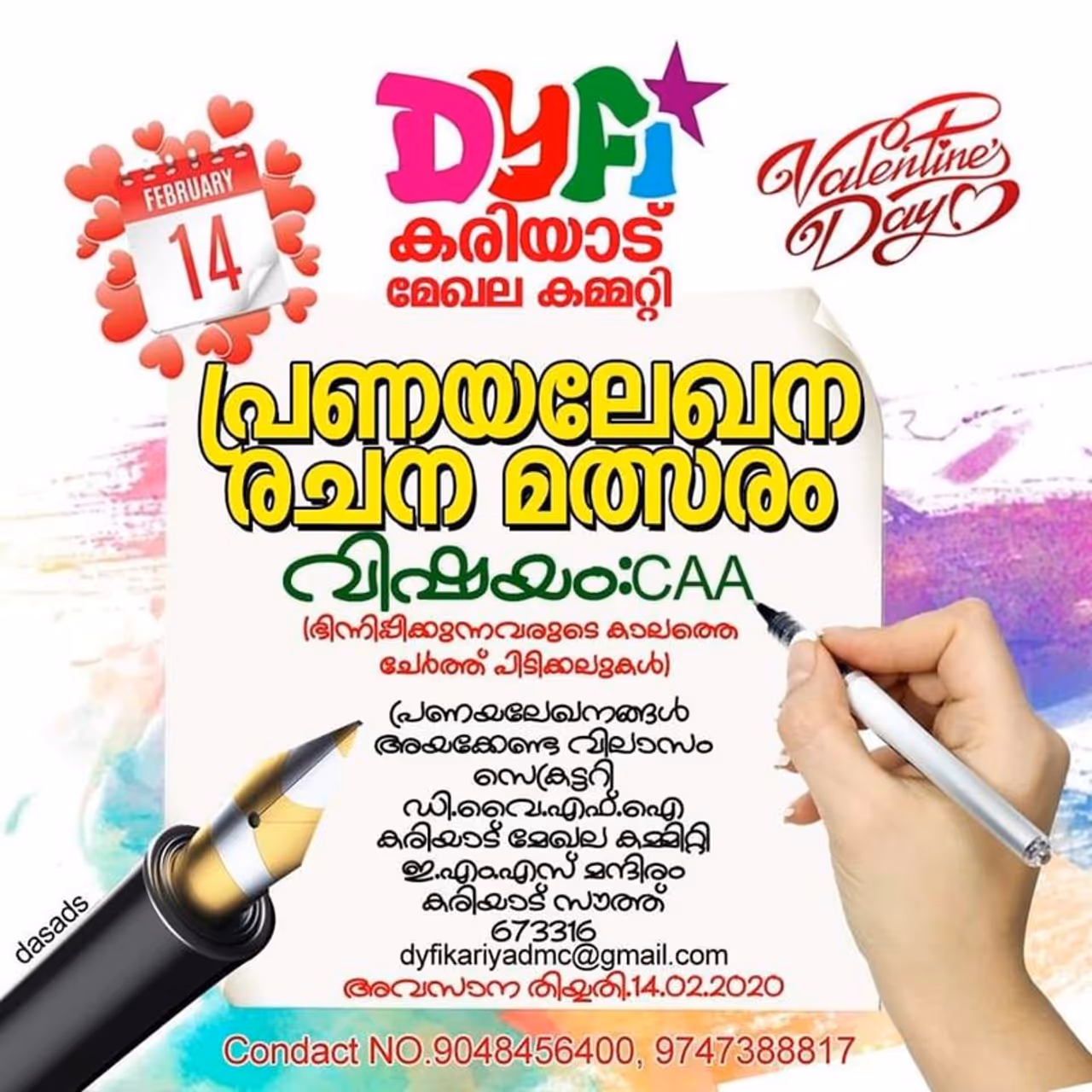 ഡിവൈഎഫ്ഐ കരിയാട് മേഖലാ കമ്മിറ്റിയുടെ നേതൃത്വത്തിലാണ് മത്സരം നടത്തുന്നത്. ഭിന്നിപ്പിക്കുന്നവരുടെ കാലത്തെ ചേര്ത്ത് പിടിക്കലുകളാണ് പ്രണയലേഖന മത്സരത്തിലൂടെ ഉദ്ദേശിക്കുന്നത്. പൗരത്വ ഭേതഗതി നിയമത്തിനെതിരെയും പ്രണയിക്കുന്നവരെ തല്ലിയോടിക്കാനെത്തുന്നുവര്ക്കുമുള്ള സര്ഗാത്മകമായ പ്രതിഷേധമാണ് ഈ മത്സരമെന്നും ഡിവൈഎഫ്ഐ കരിയാട് മേഖലാ കമ്മിറ്റി സെക്രട്ടറി പറയുന്നു.