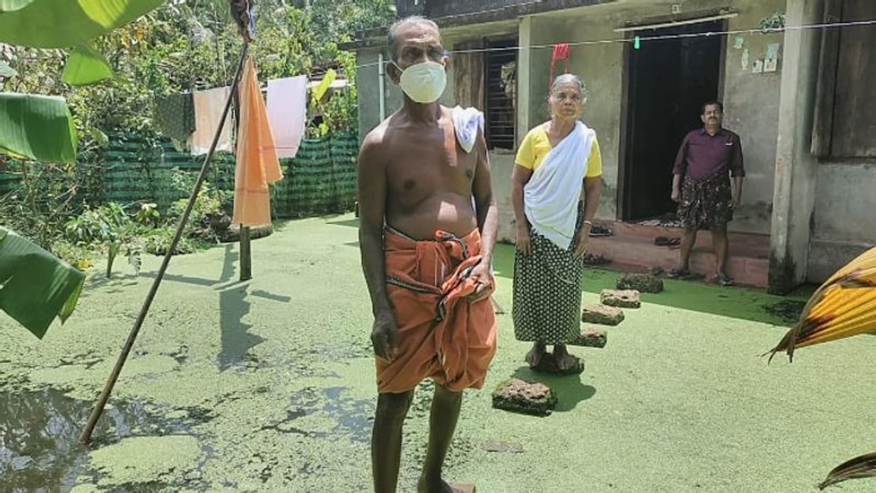 വീടിന് മുന്നിൽ കല്ലുകൾ അടുക്കി വെച്ച് ഇതിലൂടെയാണ് ഇവർ നടക്കുന്നത്. മകളും മരുമകനും കൊച്ചുമക്കളും ഉൾപ്പെടെ ആറ് പേരാണ് ഇവിടെ ഈ ദുരിതത്തിൽ കഴിയുന്നത്. അടിയന്തിരമായി ഓട നിർമിച്ചോ വെള്ളം ഒഴുക്കിക്കളഞ്ഞോ തങ്ങളുടെ ദുരിതത്തിന് പരിഹാരം കാണണമെന്നാണ് ഈ വൃദ്ധ ദമ്പതികളുടെ ആവശ്യം.