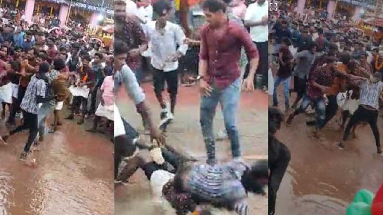 വാദ്യമേളങ്ങൾക്കിടെ ഒരു സംഘം ആളുകൾ ചെളിവെള്ളത്തിൽ കിടന്ന് അടിപിടി കൂടുന്നതും ആനപ്പിണ്ടം എടുത്ത് പരസ്പരം എറിയുന്നതും വീഡിയോയിൽ കാണാം.
