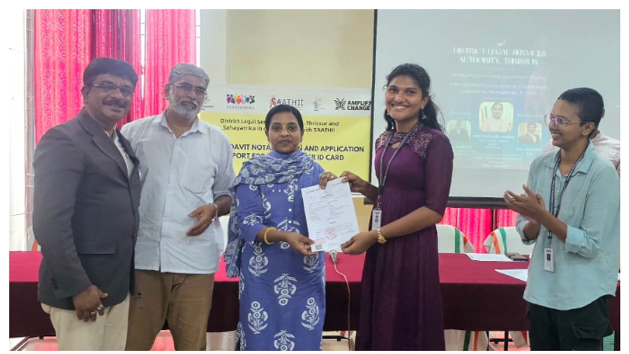തൃശൂർ: സാത്തിയും (സോളിഡാരിറ്റി ആൻഡ് ആക്ഷൻ എഗെയ്ൻസ്റ്റ് ദ എച്ച്ഐവി ഇൻഫെക്ഷൻ ഇൻ ഇന്ത്യ) സഹയാത്രികയും തൃശൂർ ജില്ലാ ലീഗൽ സർവീസസ് അതോറിറ്റിയും (DLSA) സംയുക്തമായി നടപ്പിലാക്കിയ ട്രാൻസ്ജെൻഡർ ഐഡി കാർഡിനായി അപേക്ഷിക്കുന്നവർക്കുള്ള സൗജന്യ നോട്ടറി അഫിഡവിറ്റ് അറ്റസ്റ്റേഷനും അപേക്ഷാ സഹായവും തൃശൂർ ജില്ലാ കോടതിയിലെ കോൺഫറൻസ് ഹാളിൽ സംഘടിപ്പിച്ചു. ട്രാൻസ്ജെൻഡർ ഐഡി കാർഡിന് അപേക്ഷിക്കാൻ ഒരുങ്ങുന്ന 16 ട്രാൻസ്ജെൻഡർ വ്യക്തികൾ പദ്ധതിയിൽ പങ്കെടുത്ത് ഗുണഭോക്താക്കളായി.