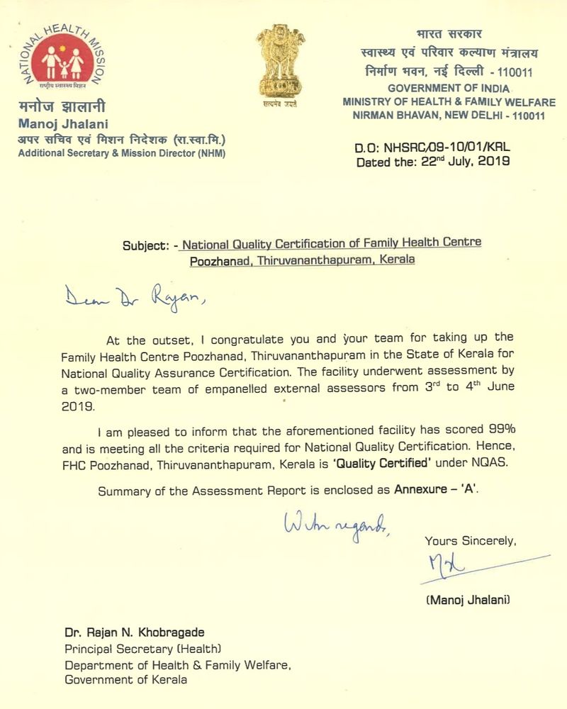 തിരുവനന്തപുരം ഒറ്റശേഖരമംഗലം പൂഴനാട് കുടുംബ ആരോഗ്യകേന്ദ്രമാണ് 99 എന്ന സ്കോറോടെ ദേശിയ ഗുണനിലവാര അംഗീകാരം കരസ്ഥമാക്കിയത്.