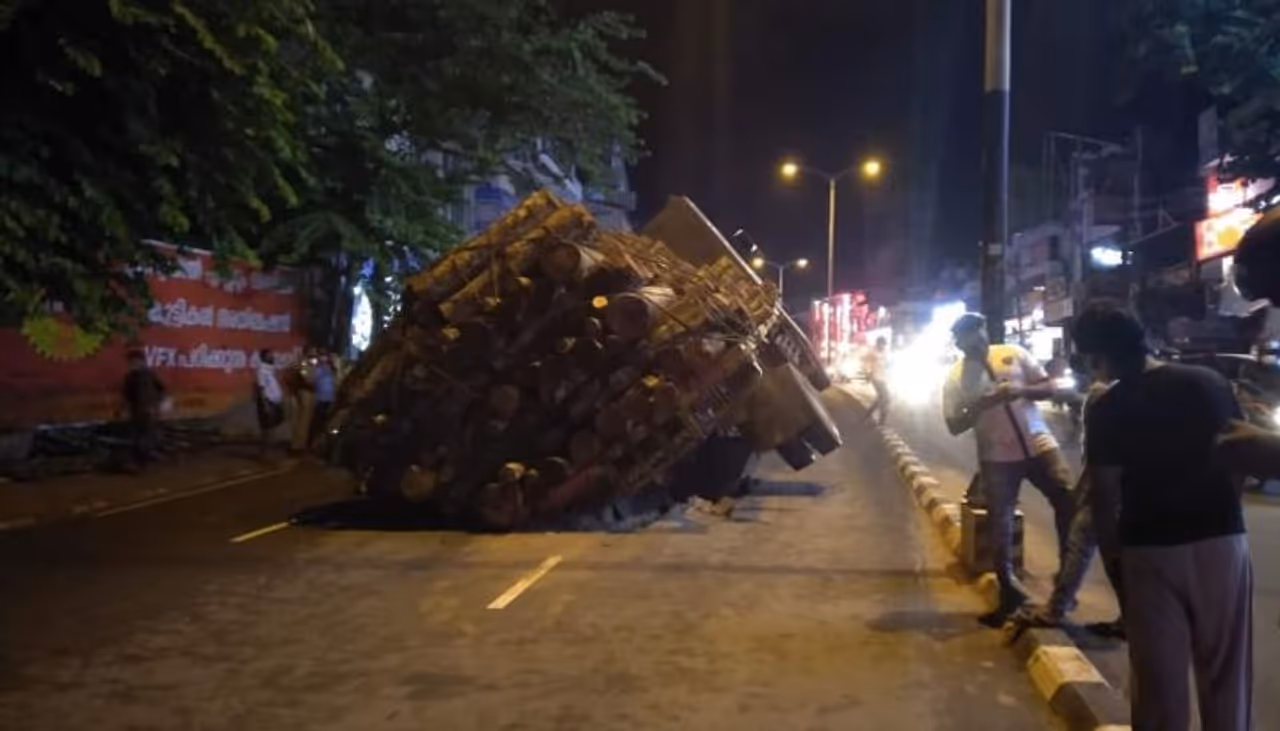 കാട്ടാക്കടയിൽ നിന്ന് റബർ തടിയുമായി കൊല്ലത്തേക്ക് പോകുകയായിരുന്നു ലോറി വാട്ടർ അതോറിട്ടി വെട്ടിപ്പൊളിച്ച റോഡിലെ മധ്യഭാഗത്തെ കുഴിയിൽ അകപ്പെട്ടത്. ഇന്നലെ രാവിലെ അറ്റകുറ്റപ്പണിക്കായി വെട്ടിപ്പൊളിച്ച റോഡ് വൈകിട്ടോടെ താത്കാലികമായി മണ്ണിട്ട് മൂടിയിരിക്കുകയായിരുന്നു.