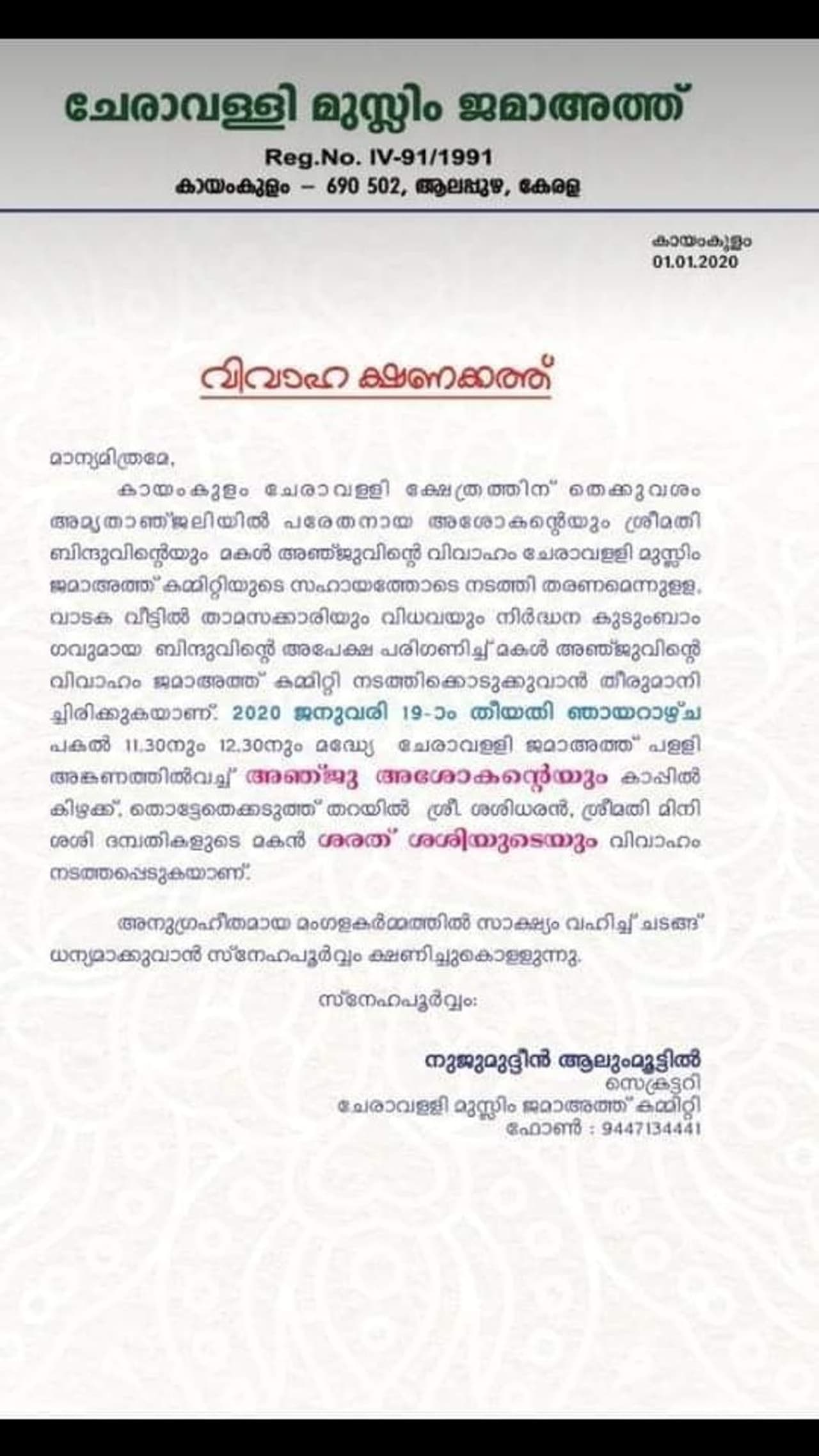 കൊല്ലം: കായംകുളം സ്വദേശിനിയായ അഞ്ജുവിന് അച്ഛനില്ല. കഴിഞ്ഞ വർഷം ഹൃദയാഘാതം വന്നാണ് അഞ്ജുവിന്റെ അച്ഛൻ അശോകൻ മൂന്നുമക്കളെയും ഭാര്യ ബിന്ദുവിനെയും വിട്ടുപിരിഞ്ഞത്. മൂത്തമകളായ അഞ്ജുവിന്റെ വിവാഹം നടത്താൻ മറ്റ് വഴികളൊന്നുമില്ലാതെ വന്നപ്പോഴാണ് വീടിന് സമീപത്തുള്ള മുസ്ലീം ജമാ അത്ത് പള്ളിക്കമ്മറ്റിയെ ബിന്ദു സമീപിക്കുന്നത്. വിവാഹത്തിന് സഹായം നൽകാമെന്ന വെറുംവാക്കല്ല, പള്ളിക്കമ്മറ്റി അംഗങ്ങൾ പറഞ്ഞത്. വിവാഹത്തിന്റെ എല്ലാ ചെലവുമുൾപ്പെടെ ആഘോഷപൂർവ്വം നടത്തിത്തരാമെന്നാണ്. ക്ഷണക്കത്ത് മുതൽ ഭക്ഷണവും ആഭരണങ്ങളും ഉൾപ്പെടെ ഒരുക്കി വിവാഹം മംഗളമായി നടത്താനുള്ള തിരക്കിലാണ് കായംകുളം ചേരാവള്ളി മുസ്ലീം ജമാ അത്ത് കമ്മിറ്റി. അഞ്ജുവിന്റെ വിവാഹത്തിന്റെ അവസാന വട്ട ഒരുക്കങ്ങളെക്കുറിച്ച് ചർച്ച ചെയ്യാൻ പ്രത്യേക ജനറൽ ബോഡി യോഗം ചേരാൻ തീരുമാനിച്ചിരിക്കുകയാണ് അംഗങ്ങൾ.