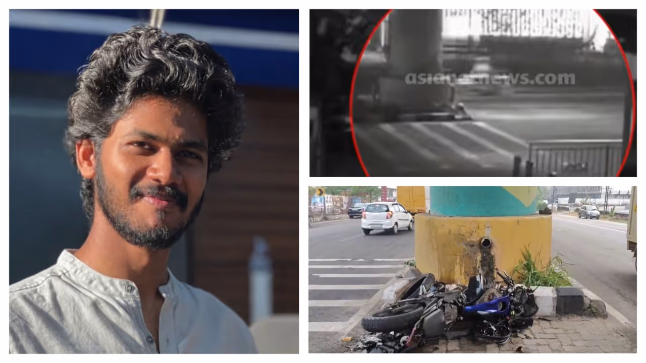 അപകടത്തിൽ ബൈക്ക് പൂർണമായി തകർന്നു പോകുന്നതും സിസിടിവി ദൃശ്യങ്ങളിൽ വ്യക്തമാണ്. ഇന്നലെ പുലർച്ചെ രണ്ടേമുക്കാൽ മണിയോടെയാണ് അപകടമുണ്ടായത്.