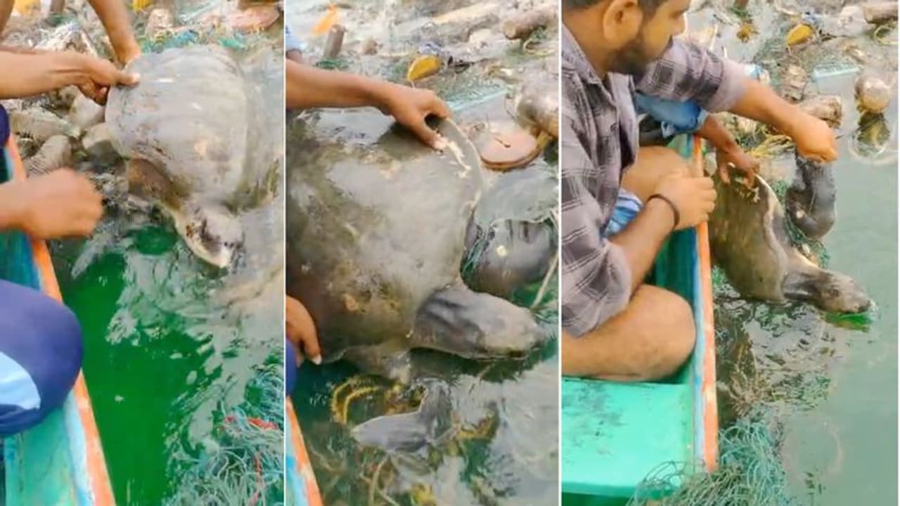 കഴിഞ്ഞ കുറച്ച് ദിവസങ്ങളായി കേരളത്തിന്റെ തീരത്ത് കാര്യമായ കോളുകളൊന്നും ലഭ്യമായിരുന്നില്ല. മത്സ്യബന്ധനത്തിന് പോയ വള്ളക്കാര്ക്ക് നിരാശയായിരുന്നു ഫലം. അതിനിടെയാണ് ഇന്ന് താനൂരില് നിന്നും മത്സ്യബന്ധനത്തിന് പോയ വള്ളക്കാര്ക്ക് ഒരു കടലാമയുടെ ജീവന് രക്ഷിക്കാന് കഴിഞ്ഞത്. കേരളത്തിന്റെ സൈന്യം എന്ന് വാട്സാപ്പ് ഗ്രൂപ്പിലാണ് ആമയെ രക്ഷപ്പെടുത്തുന്ന വീഡിയോ ആദ്യമായി വന്നത്.