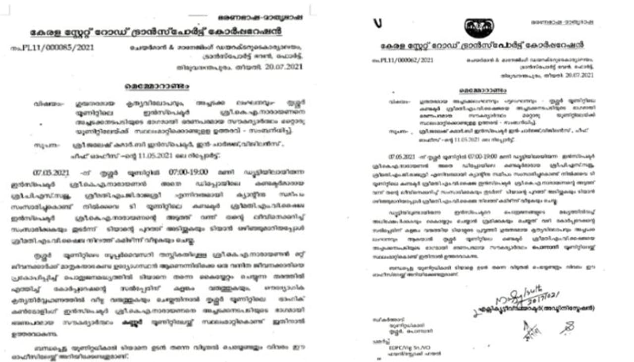 കോര്പ്പറേഷന് കളങ്കം വരുത്തുകയും ഔദ്യോഗിക കൃത്യ നിര്വ്വഹണത്തില് വീഴ്ച വരുത്തുകയും ചെയ്തതിനാണ് കെ എ നാരായണനെതിരെ നടപടിയെടുത്തത്. തൃശൂര് യൂണിറ്റിലെ ട്രാഫിക് കണ്ട്രോളിംഗ് ഇന്സ്പെക്ടറായ നാരായണനെ കണ്ണൂരേക്ക് സ്ഥലം മാറ്റാനാണ് കെഎസ്ആര്ടിസി ഉത്തരവിട്ടിരിക്കുന്നത്.