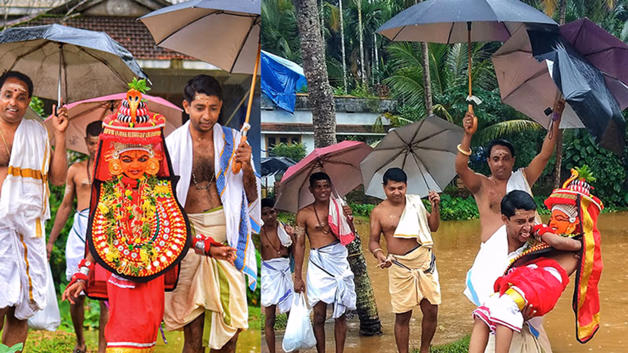 കാസർകോട്: നാടിനെ വെള്ളത്തിലാക്കിയ കനത്ത മഴയിൽ തെയ്യങ്ങൾക്കും രക്ഷയില്ല.വെള്ളപ്പൊക്കം കാരണം കർക്കിടകത്തിലെ ആധിയകറ്റാനെത്തുന്ന കുഞ്ഞുതെയ്യങ്ങളെ ചുമന്നാണ് കൊണ്ടുവരുന്നത്. പഞ്ഞമാസം എന്ന് വിശേഷണമുള്ള കർക്കിടകം മാസത്തിലെ ഒന്നാം ദിവസം മുതൽ വടക്കൻ കേരളത്തിൽ പ്രത്യേകിച്ച് കാസർകോട്ടെ ഗ്രാമീണഭവനങ്ങളിൽ വ്യാധിയും മാരിയും കെടുതികളും അകറ്റി അനുഗ്രഹം ചൊരിയാനാണ് കർക്കിട തെയ്യങ്ങൾ എത്തുന്നത്. എന്നാൽ പാടങ്ങളും നാട്ടുവഴികളും മുക്കി മഴ നിറഞ്ഞു പെയ്തതോടെ കുഞ്ഞുതെയ്യങ്ങളുടെ യാത്രയും കഷ്ടത്തിലാവുകയാണ്.