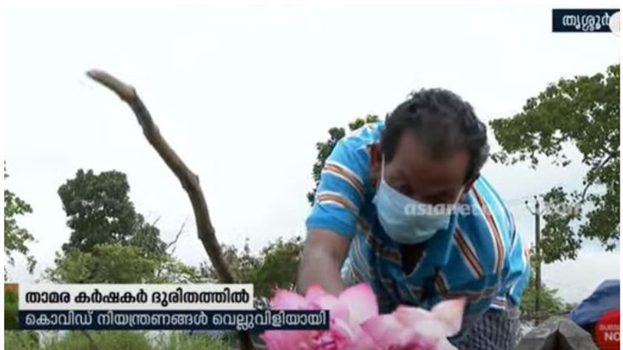 തൃശൂര്: കൊവിഡ് നിയന്ത്രണങ്ങള് മൂലം ആവശ്യക്കാരില്ലാതായതോടെ തൃശൂര് പുള്ളിലെ താമര കര്ഷകര് പ്രതിസന്ധിയില്. ദിനംപ്രതി രണ്ടായിരത്തിലധികം പൂക്കള് വിറ്റു പോയിരുന്ന ഇവിടെ നിന്ന് ഇപ്പോര് കൊണ്ടു പോകുന്നത് നൂറില് താഴെ പൂക്കള് മാത്രമാണ്. കോള് പാടങ്ങളും കാറ്റും സൂര്യാസ്തമയവും പോലെ മനോഹരമാണ് പുള്ളിലെ പൂത്തുലഞ്ഞു നില്ക്കുന്ന താമര പാടങ്ങള്.