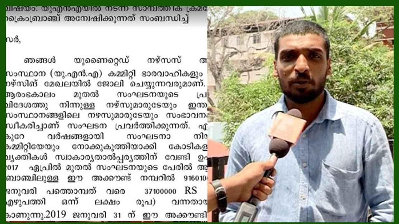 3 കോടി രൂപയുടെ തട്ടിപ്പ് നടന്നെന്ന് യുഎൻഎ വൈസ് പ്രസിഡണ്ട് സിബി മുകേഷ് ഡിജിപിക്ക് പരാതി നൽകി. നഴ്സുമാരിൽ നിന്നും ലെവി പിരിച്ചതടക്കമുള്ള തുകയിൽ നിന്നാണ് തട്ടിപ്പ് നടത്തിയതെന്നാണ് ആരോപണം.