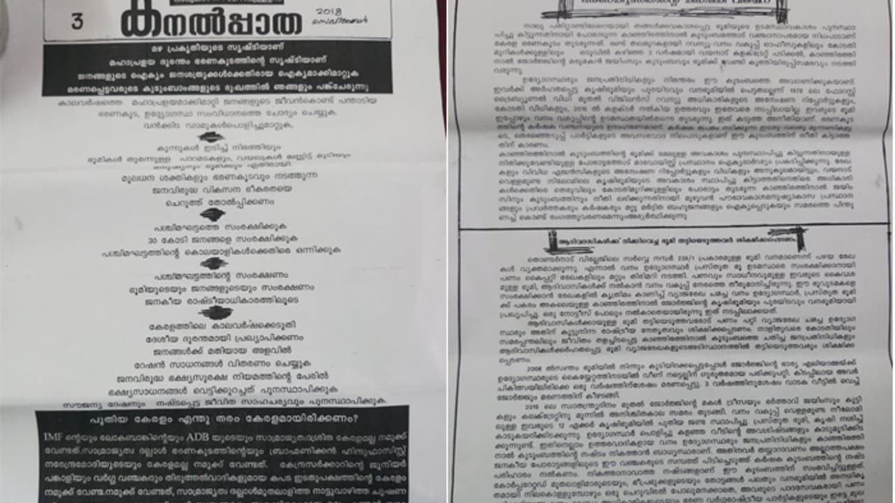 കല്പ്പറ്റ: സംസ്ഥാന സര്ക്കാരിനെതിരെ രൂക്ഷമായ വിമര്ശനങ്ങളുന്നയിച്ച് വീണ്ടും മാവോയിസ്റ്റ് ലഘുലേഖ. വയനാട് പ്രസ്ക്ലബില് ലഭിച്ച 'കനല്പാത'എന്ന ന്യൂസ് ബുള്ളറ്റിനിലാണ് പ്രളയം സര്ക്കാര് സൃഷ്ടിയായിരുന്നവെന്നതടക്കമുള്ള ആരോപണങ്ങളുന്നയിച്ചിരിക്കുന്നത്. നാടുകാണി പീപ്പിള് ലിബറേഷന് ഗറില്ല ആക്ഷന് (പി.എല്.ജി.എ) കഴിഞ്ഞ മാസം പുറത്തിറക്കിയതാണ് ബുള്ളറ്റിന്. മഹാപ്രളയം ഭരണകൂടത്തിന്റെ സൃഷ്ടിയാണ്.