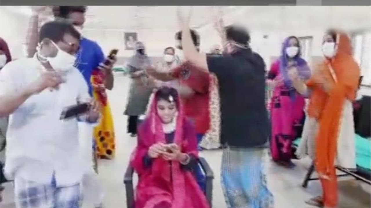 കൊച്ചി: മണവാട്ടിക്ക് ചുറ്റും ഒപ്പന മുറുകുന്നു. വധു വീഡിയോ മൊബൈലില് പകര്ത്തുന്നു. പക്ഷെ ഇത് കല്യാണ വീടല്ലെന്ന് മാത്രം. സ്ഥലം മട്ടാഞ്ചേരി ടൗണ്ഹാളിലെ കൊവിഡ് ചികില്സാ കേന്ദ്രമാണ്. മട്ടാഞ്ചേരി സ്വദേശി നിയാസും ഫോര്ട്ട് കൊച്ചി സ്വദേശി മകള് ഫായിസയും തമ്മിലായിരുന്നു വിവാഹം.
