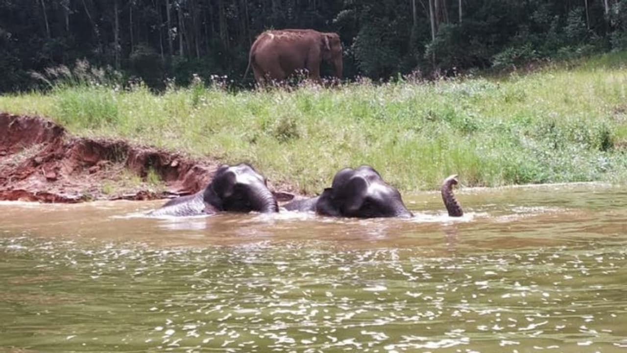 ഒന്നിനുപുറത്ത് മറ്റൊന്ന് കയറി നിന്ന് നിരാടുന്ന കാഴ്ച ബോട്ടിംഗ് ആസ്വാദിക്കുവാനെത്തിയ സന്ദർശകരും ഡ്രൈവറുമാണ് കാമറയിൽ പകർത്തി സോഷ്യൽ മീഡിയവഴി പ്രചരിപ്പിച്ചത്. കരയിൽ കൊന്പൻ നിൽക്കുകയും മറ്റുള്ള രണ്ട് ആനകൾ ജലാശയത്തിൽ കുറുന്പുകൾ കാട്ടി നീരാടുന്നതും ചിത്രത്തില് വ്യക്തമാണ്.