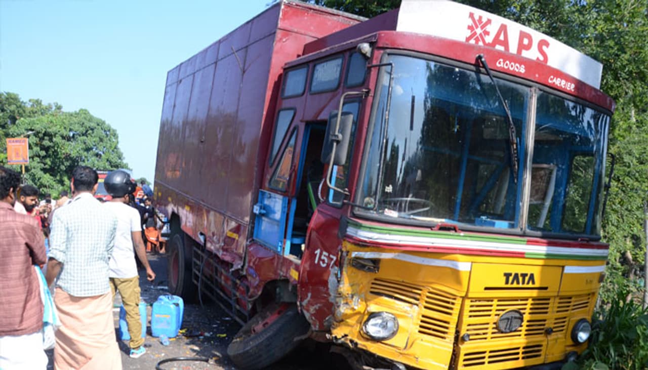ആലപ്പുഴ ഭാഗത്തേക്ക് ചെമ്മീനും കയറ്റി പോയ മിനി ലോറിയുടെ ടയർ പഞ്ചറായി നിയന്ത്രണം നഷ്ടപ്പെട്ട് എതിരെ വന്ന പാഴ്സൺ ലോറിയിലേക്ക് ഇടിച്ച് കയറുകയായിരുന്നു. അപകടത്തിൽ ചെമ്മീൻ ലോറി പൂർണ്ണമായും തകർന്നു.