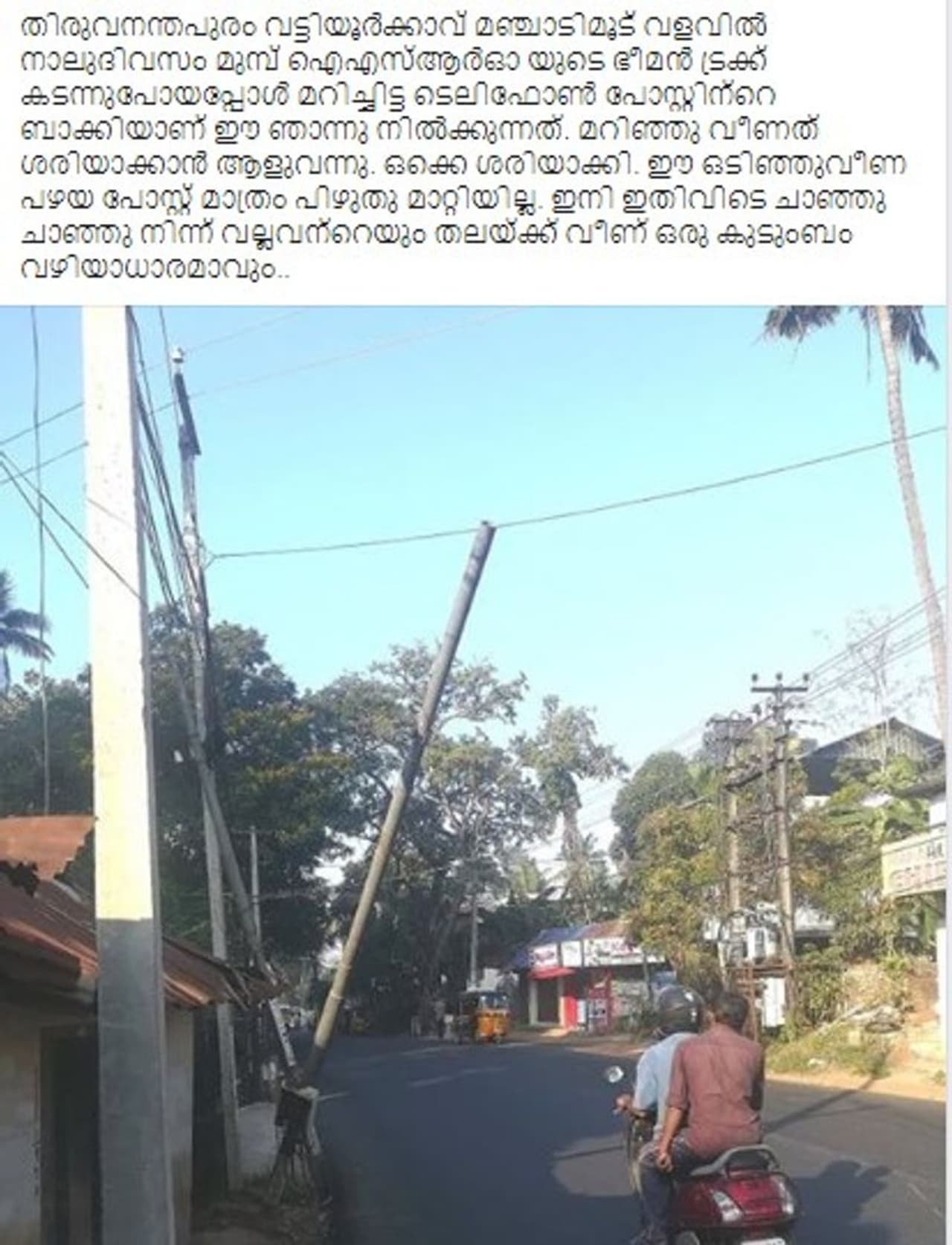 എന്നാൽ വണ്ടി തട്ടി റോഡിലേക്ക് ചെരിഞ്ഞ ആ പോസ്റ്റ് മാത്രം അവർ നീക്കിയില്ല. ദിവസവും നിരവധി സർക്കാർ വാഹനങ്ങൾ ആ വഴി പോയെങ്കിലും ആരും ഒന്നും ചെയ്തില്ല. ഈ അപകടകരമായ സാഹചര്യം കണ്ടപ്പോൾ ഫ്ളാറ്റിലെ ഒരു താമസക്കാരനാണ് എംഎൽഎയെയും കൗണ്സിലറെയും ഒക്കെ ടാഗ് ചെയ്തുകൊണ്ട് ഒരു ഫേസ് ബുക്ക് പോസ്റ്റ് വഴി ഈ ഗുരുതര സാഹചര്യത്തിലേക്ക് ശ്രദ്ധ ക്ഷണിച്ചത്.