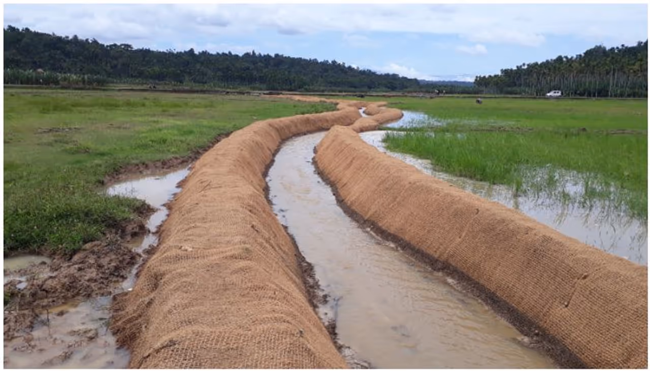 മാത്രമല്ല തോട് വഴിമാറി ഒഴുകിയതിനാല് മണലും മറ്റും പാടങ്ങളില് വന്നടിഞ്ഞിരുന്നു. ഇതിന് ശാശ്വത പരിഹാരമായാണ് കയല്ഭൂവസ്ത്രം ഉപയോഗിച്ച് തോടിന്റെ തിട്ടകള് സംരക്ഷിക്കാന് പഞ്ചായത്ത് തീരുമാനിച്ചത്. രണ്ട് വര്ഷം കൊണ്ട് കയര് പായ വിരിച്ച തിട്ടകളില് പുല്ലുമറ്റും വളര്ന്ന് തോടിന് സ്വഭാവിക സംരക്ഷണമാകും. 4,28,000 രൂപ ചിലവഴിച്ച് ഒരു കിലോമീറ്റര് നീളത്തിലാണ് തോടിന് ഇരുവശവും കയര് ഭൂവസ്ത്രം ഇട്ടത്.